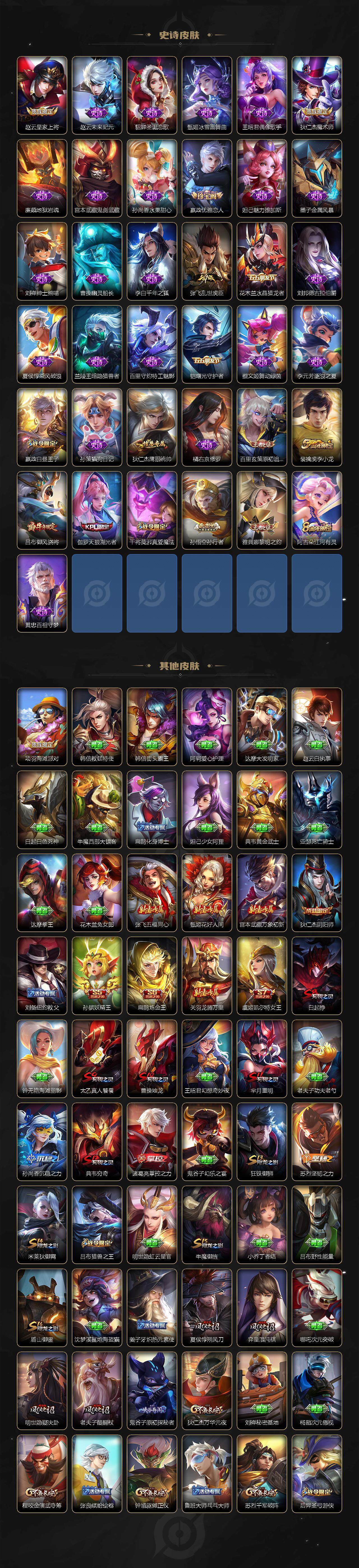 【史诗皮肤】:赵云皇家上将,赵云未来纪元,貂蝉圣诞恋歌,甄姬冰雪圆舞曲,王昭君偶像歌手,狄仁杰魔术师,廉颇地狱岩魂,宫本武藏鬼剑武藏,孙尚香水果甜心,嬴政优雅恋人,妲己魅力维加斯,墨子金属风暴,刘禅绅士熊喵,曹操幽灵船长,李白千年之狐,张飞乱世虎臣,花木兰水晶猎龙者,刘邦德古拉伯爵,夏侯惇乘风破浪,兰陵王暗隐猎兽者,百里守约特工魅影,铠曙光守护者,蔡文姬舞动绿茵,李元芳逐浪之夏,嬴政白昼王子,孙策猫狗日记,狄仁杰鹰眼统帅,橘右京修罗,百里玄策原初追逐者,裴擒虎李小龙,吕布御风骁将,伽罗天狼溯光者,干将莫邪真爱魔法,孙悟空孙行者,雅典娜黎明之约,阿古