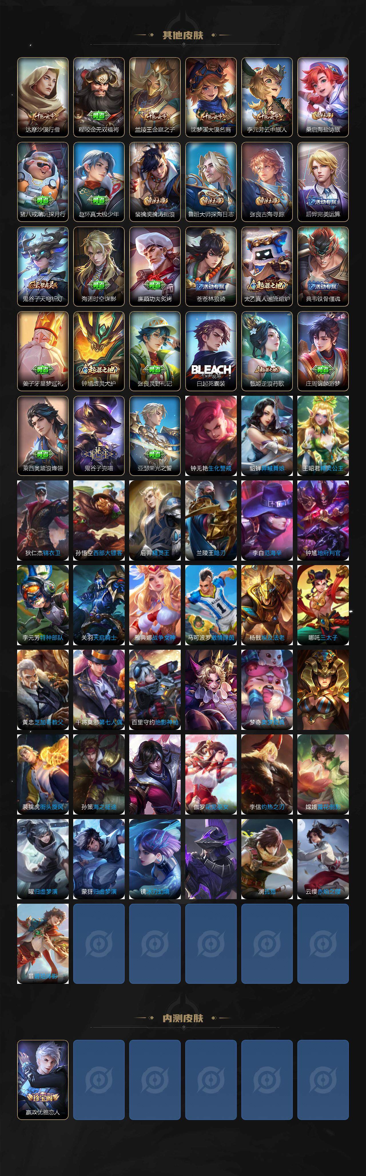 【限定皮肤】:白起狰,狄仁杰阴阳师,虞姬凯尔特女王,赵云皇家上将,嬴政优雅恋人,嬴政白昼王子,孙膑妖精王,扁鹊炼金王,芈月重明,吕布猎兽之王,吕布御风骁将,夏侯惇朔风刀,曹操烛龙,典韦穷奇,狄仁杰魔术师,狄仁杰万华元夜,达摩沙漠行僧,项羽海滩派对,老夫子醍醐杖,程咬金演武夺筹,兰陵王金庭之子,孙悟空孙行者,牛魔御旌,后羿圣弓游侠,李元芳云中旅人,钟馗驱傩正仪,干将莫邪真爱魔法,雅典娜黎明之约,太乙真人饕餮,鬼谷子原初探秘者,苏烈千军破阵,百里玄策原初追逐者,弈星混沌棋,公孙离祈雪灵祝,沈梦溪大漠名商,明世隐疑决卦,裴擒虎李小龙,裴擒虎擒涛扼浪,狂铁御狮,米莱狄御霄,伽罗天狼溯光者,盾山御銮,鲁班大师探海日志,桑启海盐诗旅,阿古朵江河有灵,张良古海寻踪,鬼谷子天穹祈灯