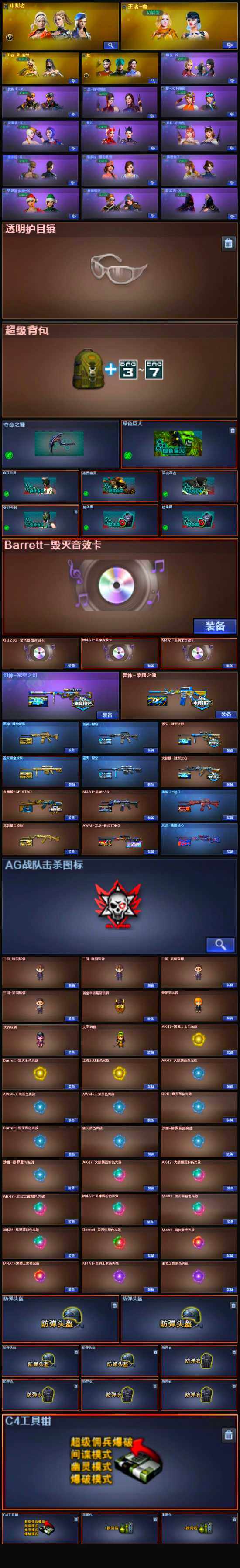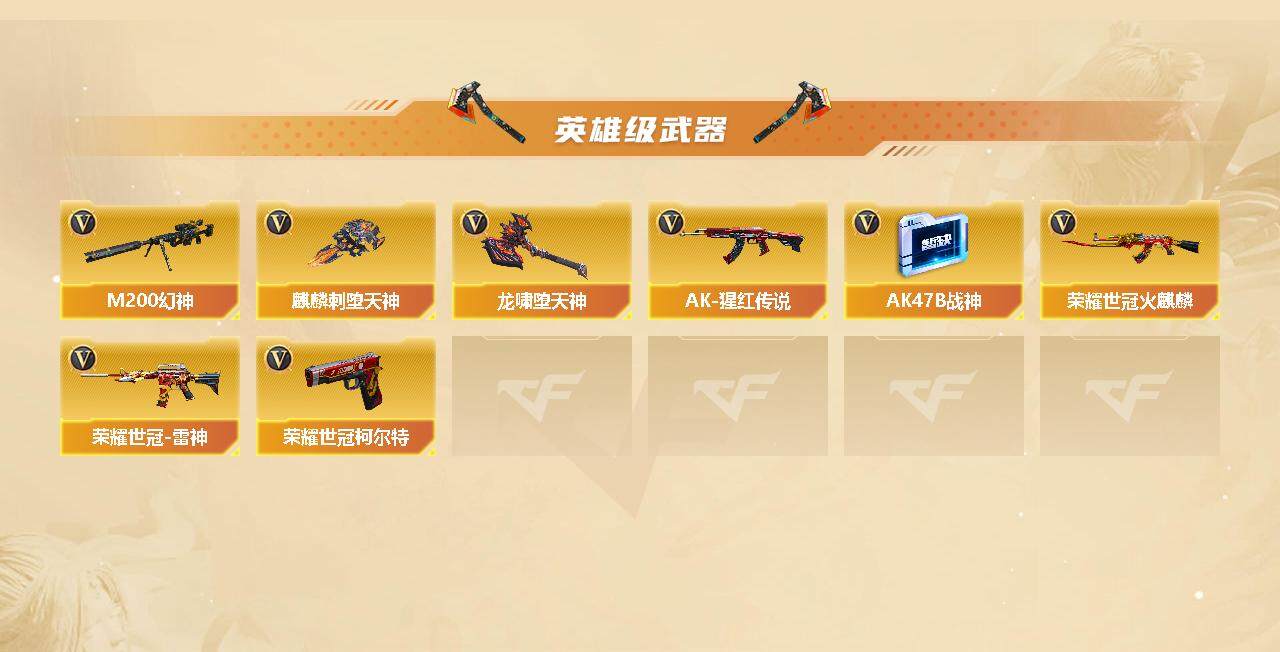 【英雄级武器】:AK47-火麒麟,M4A1-黑龙,M4A1-雷神*3,M4A1-黑骑士,AK47-无影*2,AK47-黑武士,AK12-天启,HK417-朱雀,M4A1-玫瑰精灵,QBZ03-金色蔷薇,王者之幻-觉醒版,AK-47-猩红传说*8,AK47-B-战神,AK47-B-常胜将军,荣耀世冠-火麒麟,荣耀世冠-雷神,AWM-天龙,Barrett-毁灭,AWM-裁决,M200-幻神,Barrett-朱雀,王者之力-觉醒版,RPK-盘龙,加特林-炼狱,汤姆逊-烈龙*6,沙鹰-修罗*2,沙鹰-天神*2,荣耀世冠-柯尔特,屠龙,龙啸,麒麟刺-堕天神,擎天,麒麟刺,龙啸-堕天神,高爆手雷-雷霆*5,高爆手雷-堕天神*2,闪光弹-雷霆*5,闪光弹-堕天神*2,烟雾弹-雷霆*5,烟雾弹-堕天神*2
