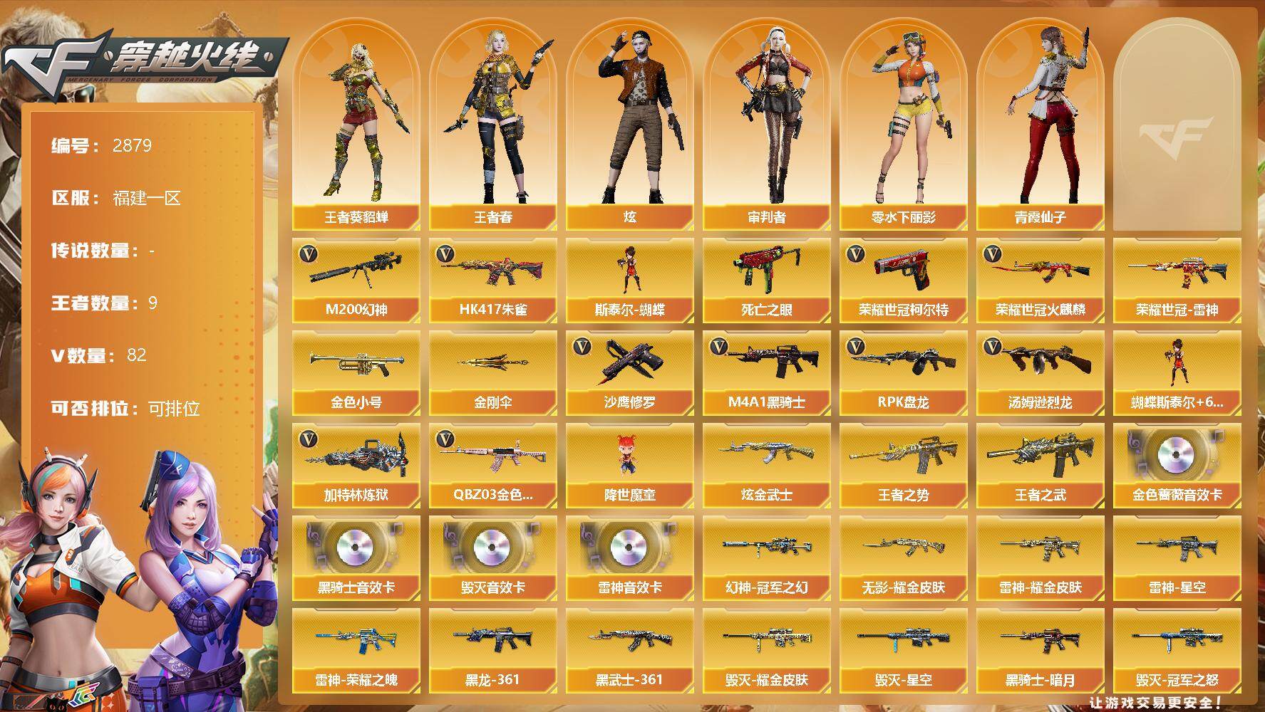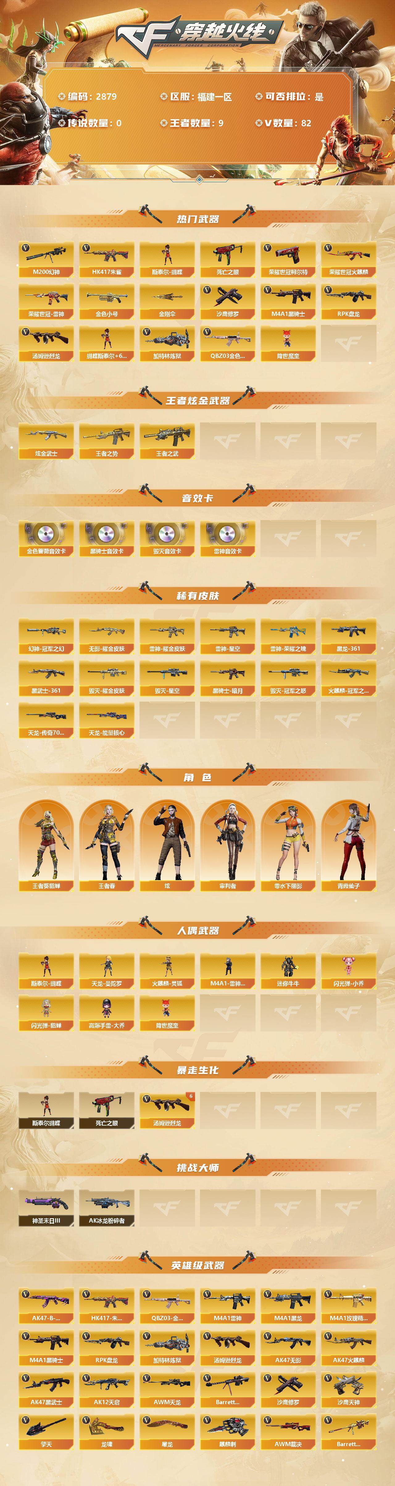 [13039231]福建一区-82V-9王者-1炫金 【热门武器】:QBZ03-金色蔷薇,HK417-朱雀,M200-幻神,死亡之眼,荣耀世冠-火麒麟,荣耀世冠-雷神,荣耀世冠-柯尔特,金色小号,M4A1-黑骑士,汤姆逊-烈龙*6,RPK-盘龙,加特林-炼狱,斯泰尔-蝴蝶,降世魔童,沙鹰-修罗*2,金刚伞 【王者炫金武器】:王者之势,王者之武,炫金武士 【音效卡】:M4A1-雷神音效卡,M4A1-黑骑士音效卡,Barrett-毁灭音效卡,QBZ03-金色蔷薇音效卡 【皮肤】:幻神-冠军之幻,雷神-荣耀之魄,雷神-星空,雷神-耀金皮肤,火麒麟-雷神,火麒麟-冠军之心,毁灭耀金皮肤,毁灭-星空,毁灭-冠军之怒,M4A1-黑龙-361,黑骑士-暗月,无影耀金皮肤,AK47-黑武士-361,战神-粉色甜心皮肤*4,战神-紫绶金章皮肤*4,战神-流金岁月皮肤,AK47-B-常胜将军-曹操,AK47-B-常胜将军-刘备*3,AK47-B-常胜将军-孙权,天龙-能量核心,AWM-天龙-传奇70KG 【角色】:审判者,炫,王者-葵-貂蝉,王者春,零-水下丽影,青霞仙子 【人偶武器】:天龙-曼陀罗,火麒麟-灵狐,M4A1-雷神-精英刀锋*2,斯泰尔-蝴蝶,降世魔童,迷你牛牛*5,闪光弹-小乔*2,闪光弹-貂蝉,高爆手雷-大乔 【暴走生化】:斯泰尔-蝴蝶,死亡之眼 【挑战大师】:AK47-冰龙粉碎者,神圣爆裂者-末日III*2 【英雄级武器】:AK47-火麒麟,M4A1-黑龙,M4A1-雷神*3,M4A1-黑骑士,AK47-无影*2,AK47-黑武士,AK12-天启,HK417-朱雀,M4A1-玫瑰精灵,QBZ03-金色蔷薇,王者之幻-觉醒版,AK-47-猩红传说*8,AK47-B-战神,AK47-B-常胜将军,荣耀世冠-火麒麟,荣耀世冠-雷神,AWM-天龙,Barrett-毁灭,AWM-裁决,M200-幻神,Barrett-朱雀,王者之力-觉醒版,RPK-盘龙,加特林-炼狱,汤姆逊-烈龙*6,沙鹰-修罗*2,沙鹰-天神*2,荣耀世冠-柯尔特,屠龙,龙啸,麒麟刺-堕天神,擎天,麒麟刺,龙啸-堕天神,高爆手雷-雷霆*5,高爆手雷-堕天神*2,闪光弹-雷霆*5,闪光弹-堕天神*2,烟雾弹-雷霆*5,烟雾弹-堕天神*2 【特殊枪械】:蝴蝶斯泰尔+6烈龙,1黑骑士,6烈龙,1盘龙,1炼狱,1蝴蝶斯泰尔