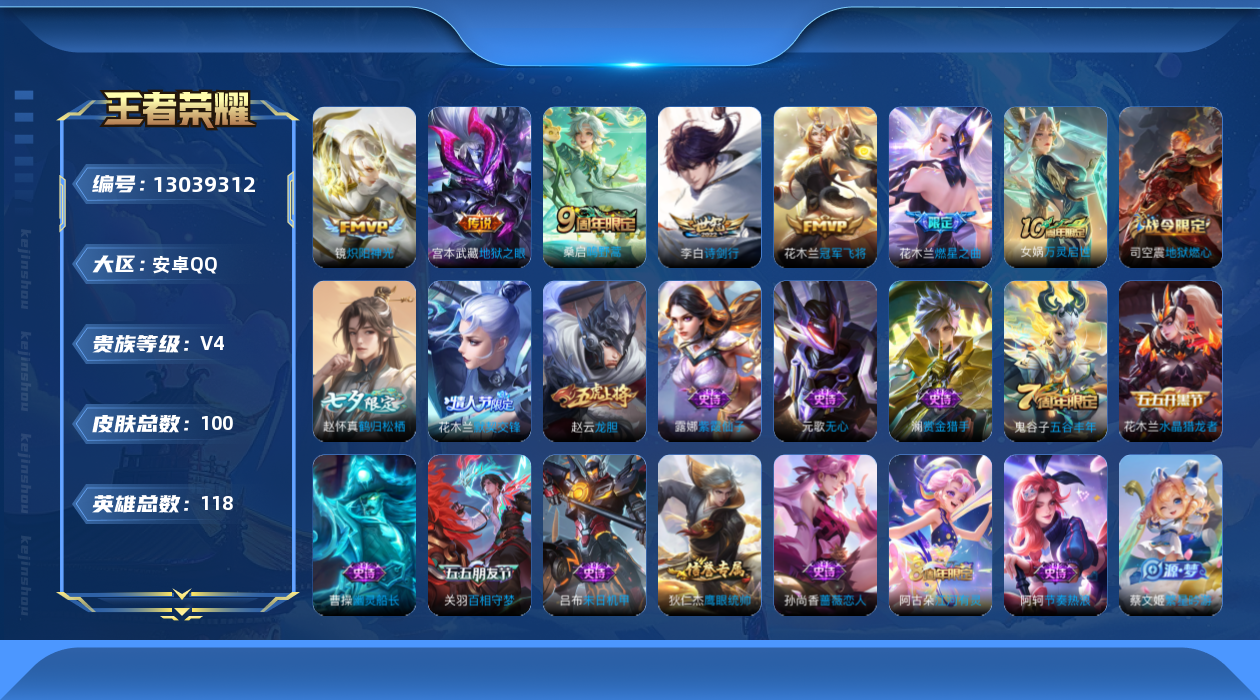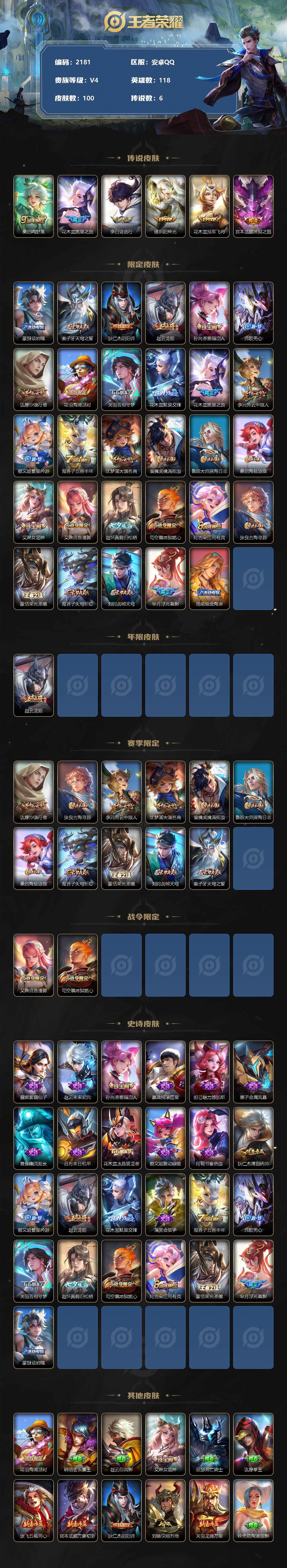 [13039312]安卓Q-V4-最强王者段位-118英雄-100皮肤-0典藏-0珍品无双-0无双-0珍品传说-6传说-26史诗