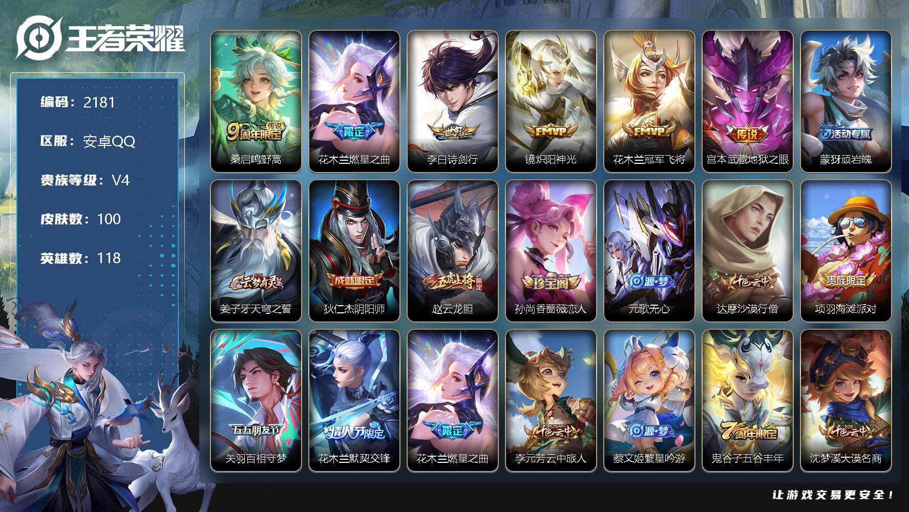 [13039312]安卓Q-V4-最强王者段位-118英雄-100皮肤-0典藏-0珍品无双-0无双-0珍品传说-6传说-26史诗 【传说皮肤】:桑启鸣野蒿,花木兰燃星之曲,李白诗剑行,镜炽阳神光,花木兰冠军飞将,宫本武藏地狱之眼 【限定皮肤】:蒙犽顽岩魄,姜子牙天穹之誓,狄仁杰阴阳师,赵云龙胆,孙尚香蔷薇恋人,元歌无心,达摩沙漠行僧,项羽海滩派对,关羽百相守梦,花木兰默契交锋,花木兰燃星之曲,李元芳云中旅人,蔡文姬繁星吟游,鬼谷子五谷丰年,沈梦溪大漠名商,裴擒虎擒涛扼浪,鲁班大师探海日志,桑启海盐诗旅,艾琳女武神,艾琳流音漫舞,赵怀真鹤归松栖,司空震地狱燃心,阿古朵江河有灵,张良古海寻踪,蒙恬荣光圣徽,鬼谷子天穹祈灯,刘邦剑破天穹,芈月浮光幕影,周瑜熔金海岸 【年限皮肤】:赵云龙胆 【赛季限定】:达摩沙漠行僧,张良古海寻踪,李元芳云中旅人,沈梦溪大漠名商,裴擒虎擒涛扼浪,鲁班大师探海日志,桑启海盐诗旅,鬼谷子天穹祈灯,蒙恬荣光圣徽,刘邦剑破天穹,姜子牙天穹之誓 【战令限定】:艾琳流音漫舞,司空震地狱燃心 【史诗皮肤】:露娜紫霞仙子,赵云未来纪元,孙尚香蔷薇恋人,嬴政摇滚巨星,妲己魅力维加斯,墨子金属风暴,曹操幽灵船长,吕布末日机甲,花木兰水晶猎龙者,蔡文姬舞动绿茵,阿轲节奏热浪,狄仁杰鹰眼统帅,蔡文姬繁星吟游,赵云龙胆,花木兰默契交锋,澜赏金猎手,鬼谷子五谷丰年,元歌无心,关羽百相守梦,赵怀真鹤归松栖,司空震地狱燃心,阿古朵江河有灵,蒙恬荣光圣徽,芈月浮光幕影,蒙犽顽岩魄,女娲万灵启世 【其他皮肤】:项羽海滩派对,韩信街头霸王,赵云忍炎影,艾琳女武神,亚瑟死亡骑士,达摩拳王,张飞五福同心,宫本武藏万象初新,狄仁杰阴阳师,刘备汉昭烈帝,关羽龙腾万里,钟无艳海滩丽影,王昭君幻想奇妙夜,狂铁命运角斗场,苏烈坚韧之力,小乔丁香结,哪吒次元突破,张良缤纷绘卷,鲁班大师乓乓大师,达摩沙漠行僧,沈梦溪大漠名商,李元芳云中旅人,桑启海盐诗旅,海月幻泉雾影,猪八戒潮玩探月行,赵怀真太极少年,裴擒虎擒涛扼浪,太乙真人劲辣红锅,莱西奥西部游侠,鲁班大师探海日志,李元芳妄想特派,哪吒热血海滩,艾琳流音漫舞,张良古海寻踪,钟无艳聚星闪耀,鬼谷子天穹祈灯,刘邦剑破天穹,大司命暗都幽影,姜子牙天穹之誓,周瑜熔金海岸,东皇太一噬灭天穹,西施雪境奇遇,钟馗虚灵犬护,露娜命运加冕,甄姬逆浪荇歌,哪吒罗小黑战记,亚瑟荣光