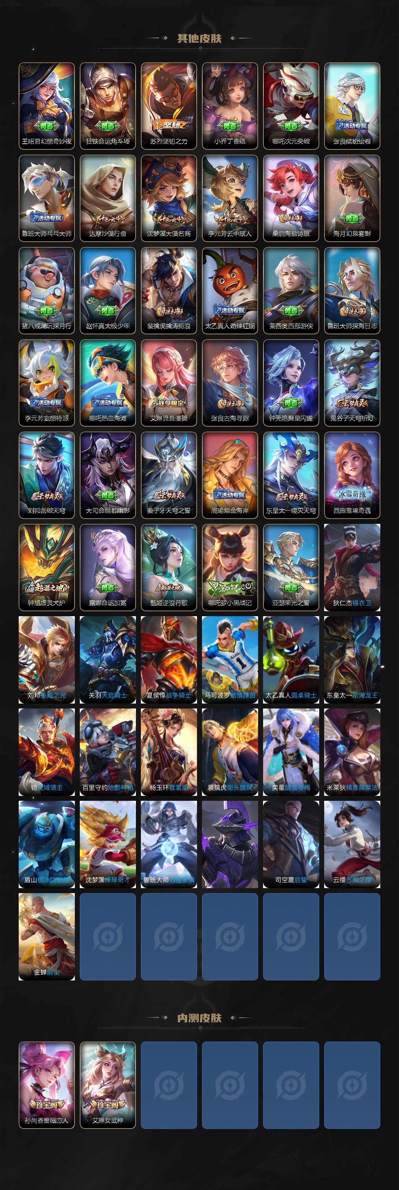 【限定皮肤】:蒙犽顽岩魄,姜子牙天穹之誓,狄仁杰阴阳师,赵云龙胆,孙尚香蔷薇恋人,元歌无心,达摩沙漠行僧,项羽海滩派对,关羽百相守梦,花木兰默契交锋,花木兰燃星之曲,李元芳云中旅人,蔡文姬繁星吟游,鬼谷子五谷丰年,沈梦溪大漠名商,裴擒虎擒涛扼浪,鲁班大师探海日志,桑启海盐诗旅,艾琳女武神,艾琳流音漫舞,赵怀真鹤归松栖,司空震地狱燃心,阿古朵江河有灵,张良古海寻踪,蒙恬荣光圣徽,鬼谷子天穹祈灯,刘邦剑破天穹,芈月浮光幕影,周瑜熔金海岸