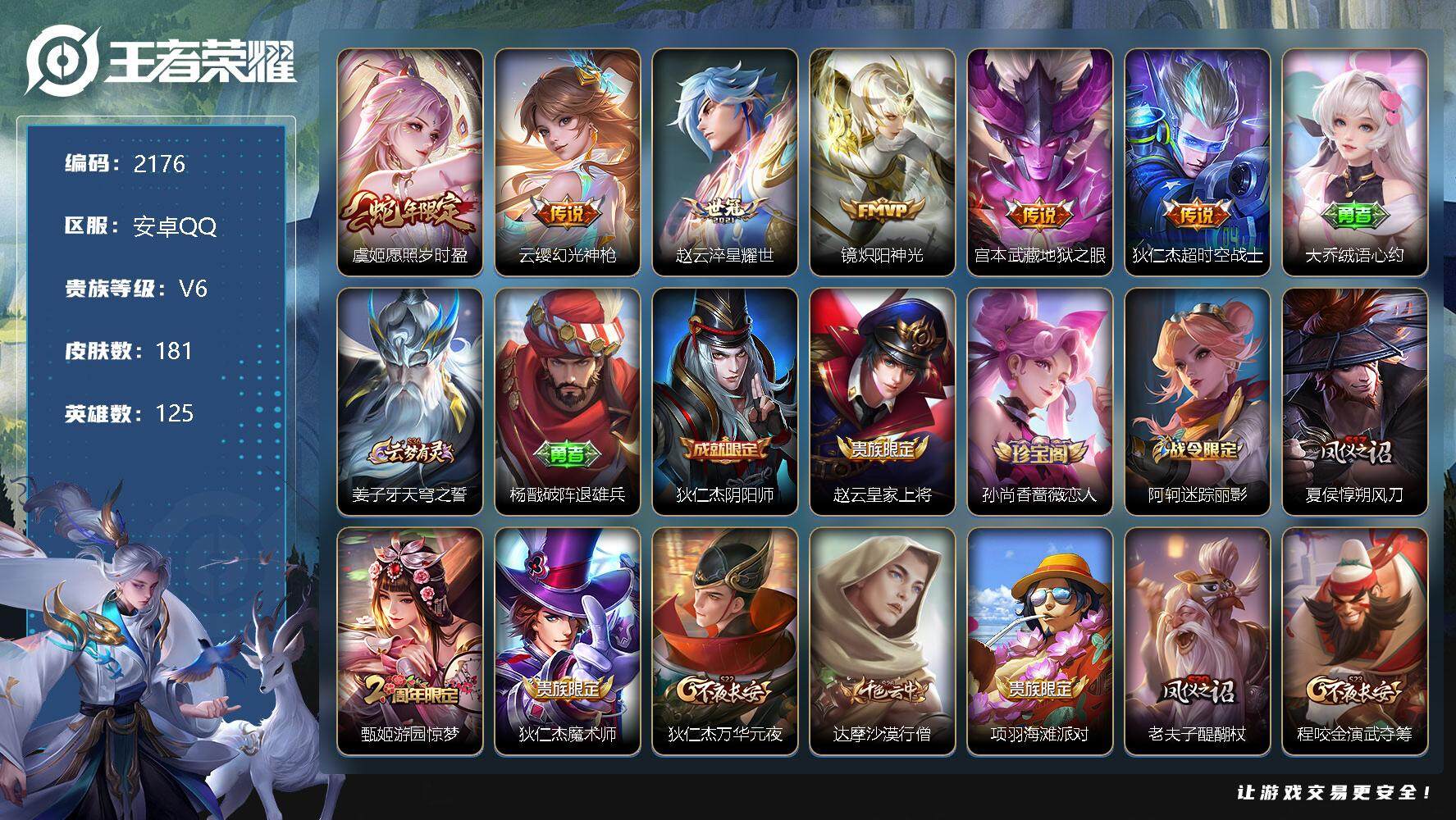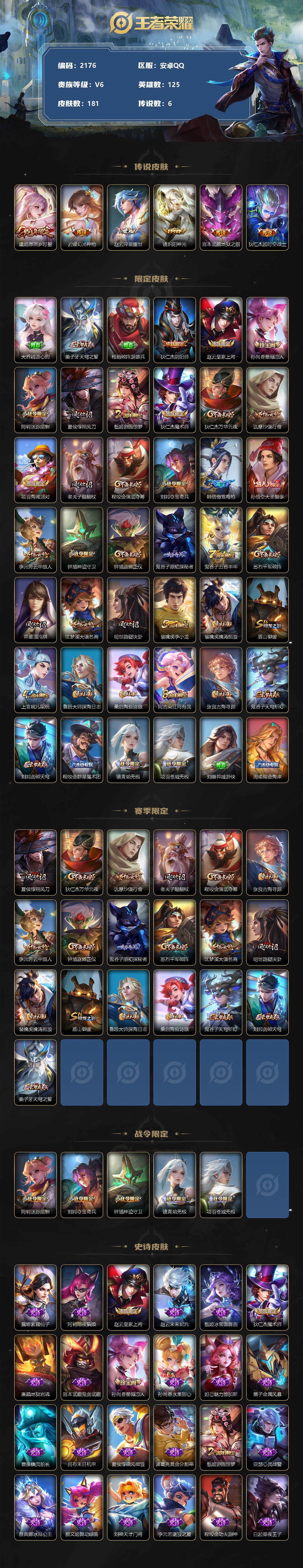 [13039400]安卓Q-V6-最强王者段位-125英雄-181皮肤-0典藏-0珍品无双-0无双-0珍品传说-6传说-42史诗