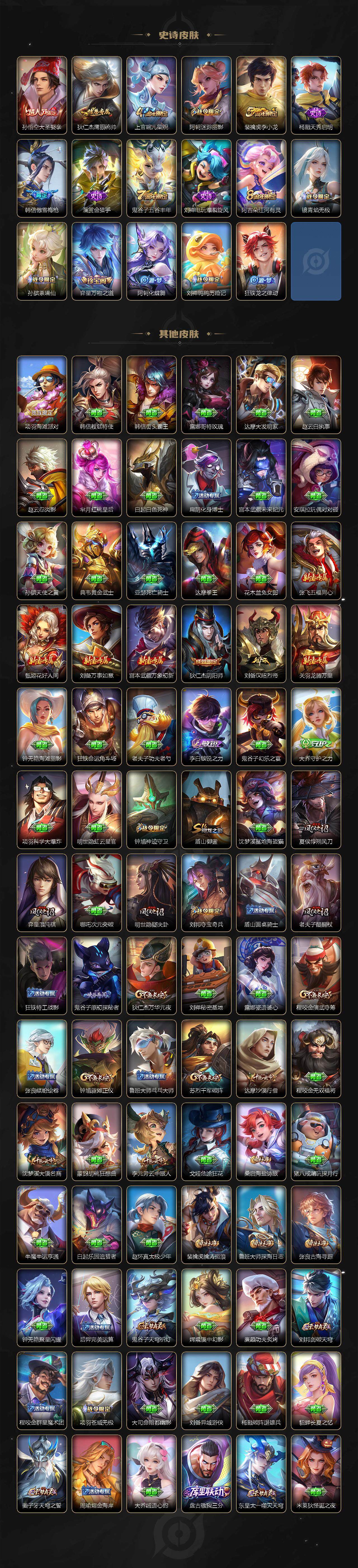 【史诗皮肤】:露娜紫霞仙子,阿轲暗夜猫娘,赵云皇家上将,赵云未来纪元,甄姬冰雪圆舞曲,狄仁杰魔术师,廉颇地狱岩魂,宫本武藏鬼剑武藏,孙尚香蔷薇恋人,孙尚香水果甜心,妲己魅力维加斯,墨子金属风暴,曹操幽灵船长,吕布末日机甲,夏侯惇乘风破浪,诸葛亮黄金分割率,甄姬游园惊梦,亚瑟心灵战警,雅典娜冰冠公主,蔡文姬舞动绿茵,刘禅天才门将,李元芳逐浪之夏,程咬金功夫厨神,白起星夜王子,孙悟空大圣娶亲,狄仁杰鹰眼统帅,上官婉儿梁祝,阿轲迷踪丽影,裴擒虎李小龙,杨戬天秀启明,韩信傲雪梅枪,澜赏金猎手,鬼谷子五谷丰年,刘禅电玩爆裂旋风,阿古朵江河有灵,镜青焰无极,孙膑茶境仙,弈星万物之道,阿轲化蝶舞,刘禅鸭鸭历险记,狂铁龙之律动,女娲万灵启世