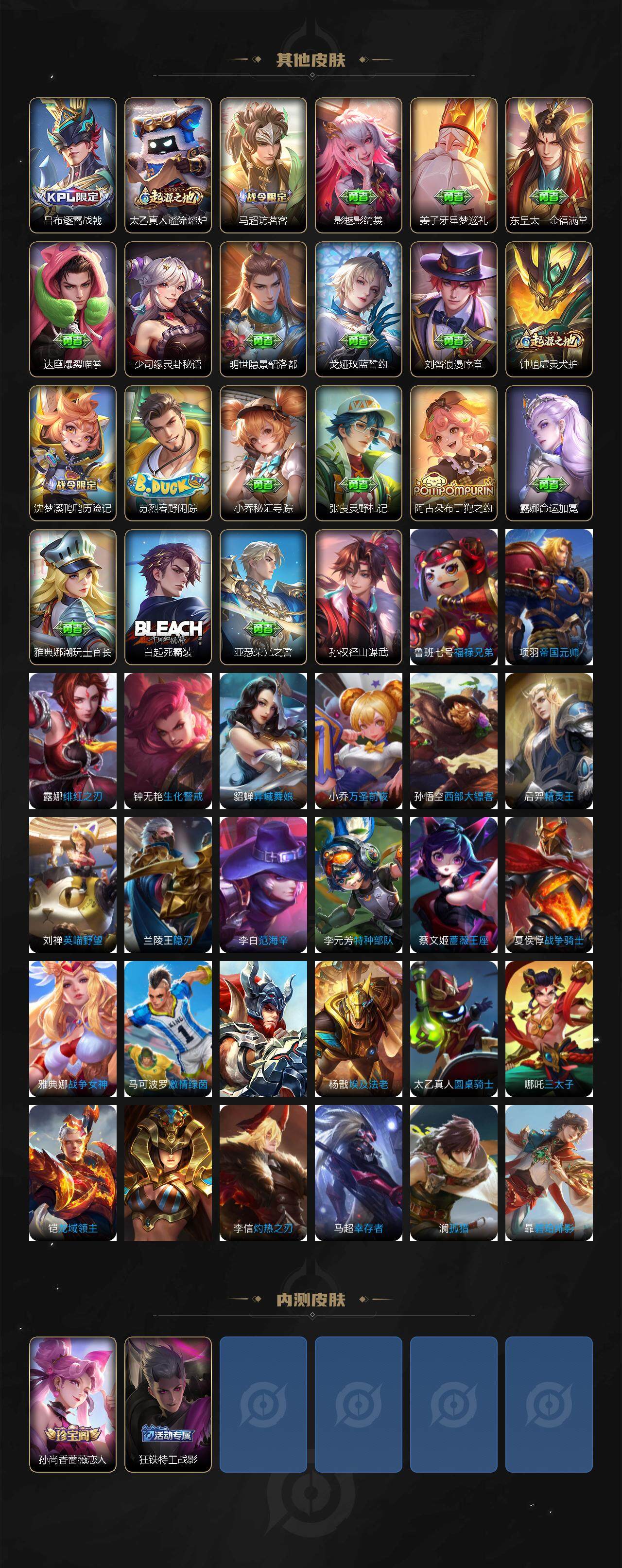 【限定皮肤】:大乔绒语心约,姜子牙天穹之誓,杨戬破阵退雄兵,狄仁杰阴阳师,赵云皇家上将,孙尚香蔷薇恋人,阿轲迷踪丽影,夏侯惇朔风刀,甄姬游园惊梦,狄仁杰魔术师,狄仁杰万华元夜,达摩沙漠行僧,项羽海滩派对,老夫子醍醐杖,程咬金演武夺筹,刘邦夺宝奇兵,韩信傲雪梅枪,孙悟空大圣娶亲,李元芳云中旅人,钟馗神迹守卫,钟馗驱傩正仪,鬼谷子原初探秘者,鬼谷子五谷丰年,苏烈千军破阵,弈星混沌棋,沈梦溪大漠名商,明世隐疑决卦,裴擒虎李小龙,裴擒虎擒涛扼浪,盾山御銮,上官婉儿梁祝,鲁班大师探海日志,桑启海盐诗旅,阿古朵江河有灵,张良古海寻踪,鬼谷子天穹祈灯,刘邦剑破天穹,程咬金群星魔术团,镜青焰无极,项羽苍威无极,刘备异域游侠,周瑜熔金海岸