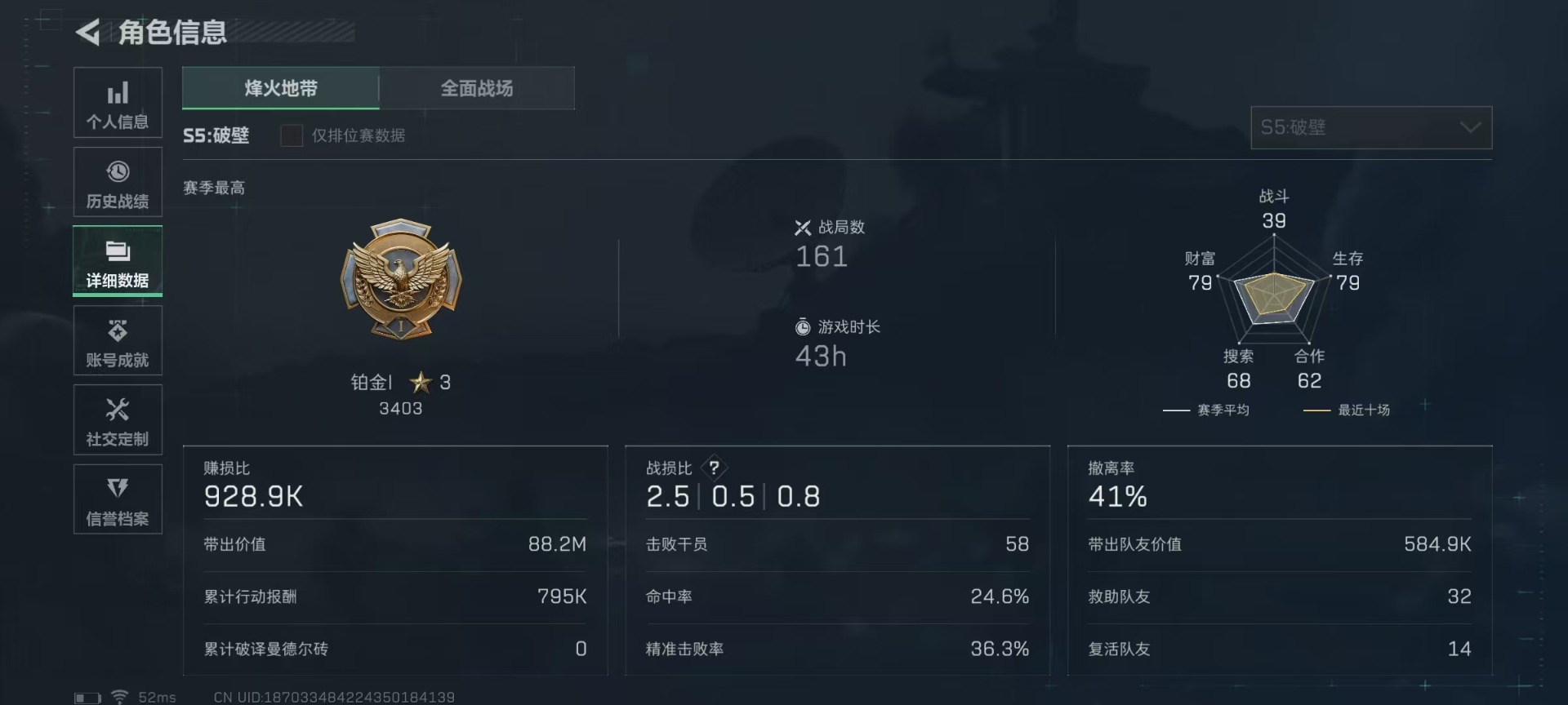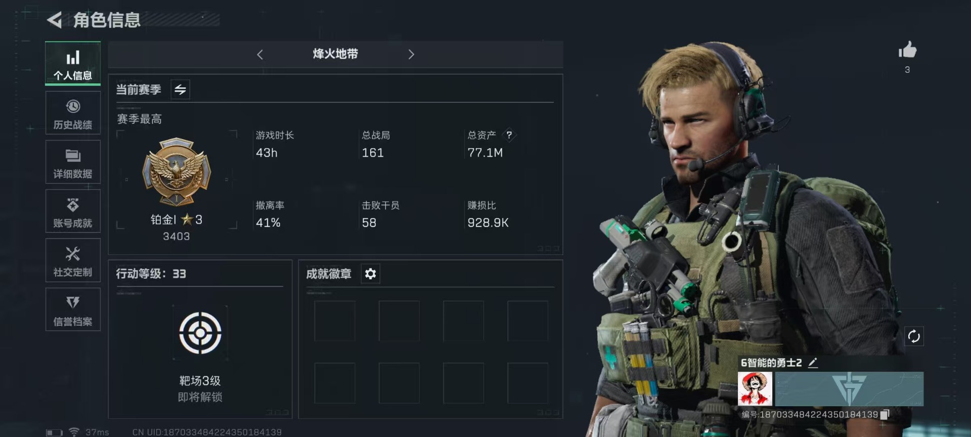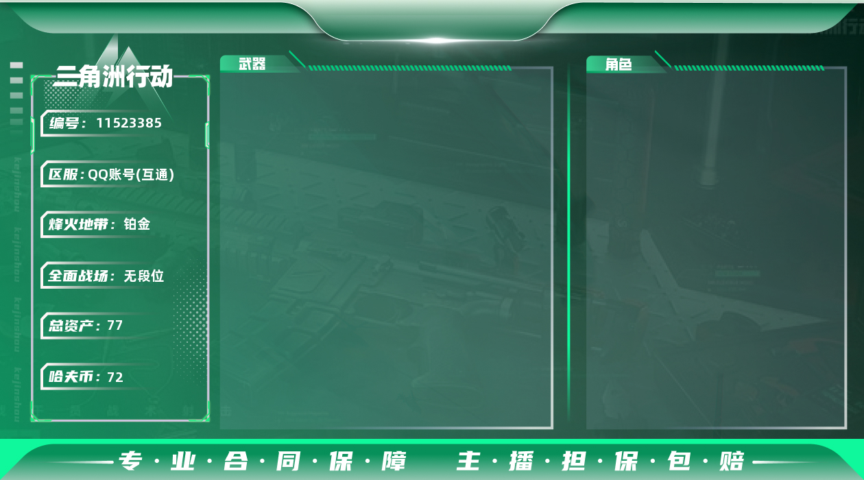 [11523385]总资产:77.1M 哈夫币:72.684K 可二次 可修改实名 【烽火地带段位】:铂金 【全面战场段位】:无段位
