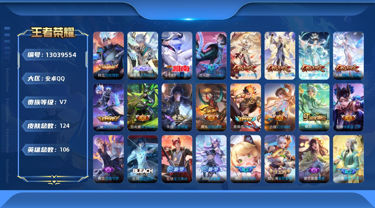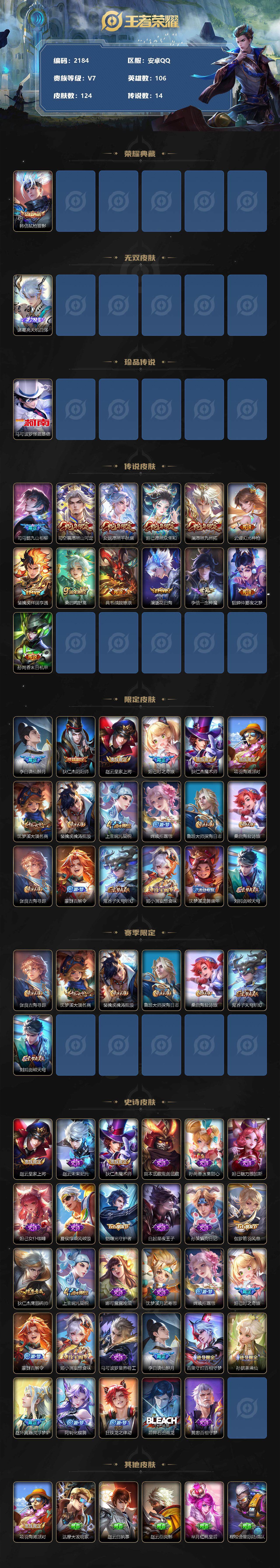 [13039554]安卓Q-V7-永恒钻石I段位-106英雄-124皮肤-1典藏-0珍品无双-1无双-1珍品传说-14传说-30史诗