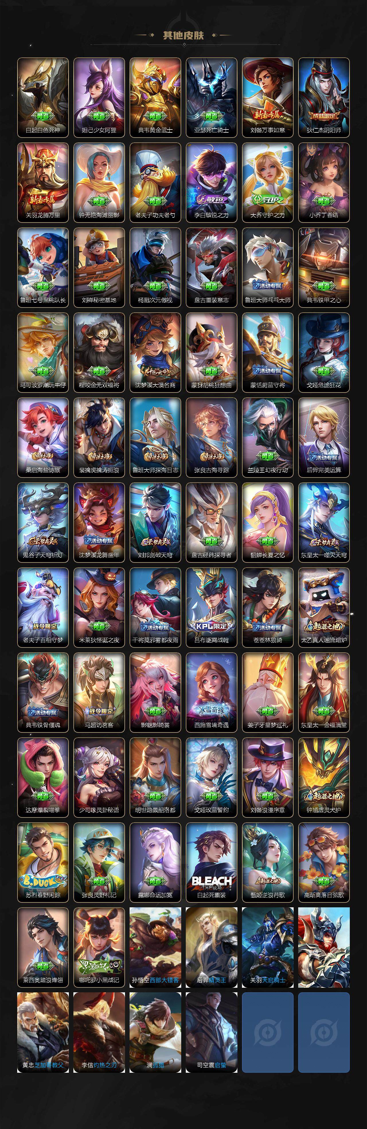 【其他皮肤】:项羽海滩派对,达摩大发明家,赵云白执事,赵云忍炎影,芈月红桃皇后,程咬金星际陆战队,白起白色死神,妲己少女阿狸,典韦黄金武士,亚瑟死亡骑士,刘备万事如意,狄仁杰阴阳师,关羽龙腾万里,钟无艳海滩丽影,老夫子功夫老勺,李白敏锐之力,大乔守护之力,小乔丁香结,鲁班七号黑桃队长,刘禅秘密基地,杨戬次元傲视,盘古重装意志,鲁班大师乓乓大师,典韦铁甲之心,马可波罗潮玩牛仔,程咬金无双福将,沈梦溪大漠名商,蒙犽胡桃狂想曲,蒙恬蔚蓝守将,戈娅危途狂花,桑启海盐诗旅,裴擒虎擒涛扼浪,鲁班大师探海日志,张良古海寻踪,兰陵王幻夜行动,后羿完美运算,鬼谷子天穹祈灯,沈梦溪龙舞盛年,刘邦剑破天穹,盘古经纬探寻者,貂蝉长夏之忆,东皇太一噬灭天穹,老夫子百相守梦,米莱狄怪诞之夜,干将莫邪雾都夜雨,吕布逐霄战戟,苍苍林狼