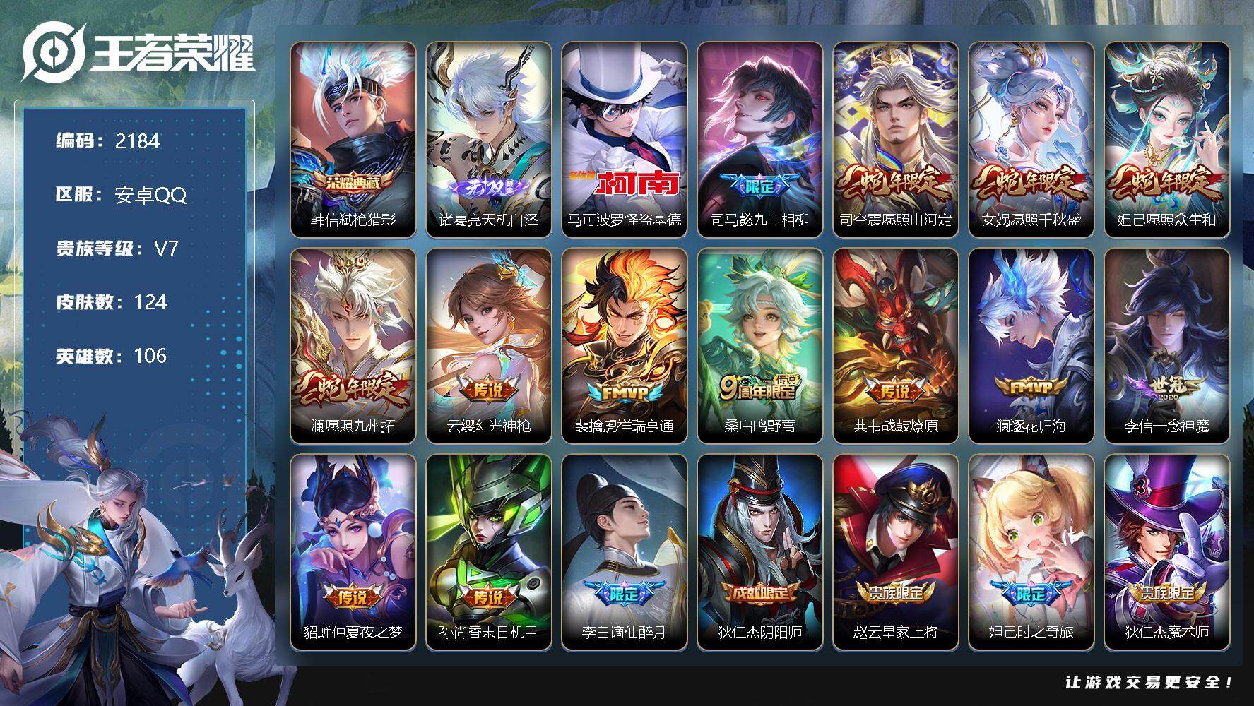 [13039554]安卓Q-V7-永恒钻石I段位-106英雄-124皮肤-1典藏-0珍品无双-1无双-1珍品传说-14传说-30史诗 【英雄全皮】:影全皮 【荣耀典藏】:韩信弑枪猎影 【无双皮肤】:诸葛亮天机白泽 【珍品传说】:马可波罗怪盗基德 【传说皮肤】:后羿神树通天,司马懿九山相柳,司空震愿照山河定,女娲愿照千秋盛,妲己愿照众生和,澜愿照九州拓,云缨幻光神枪,裴擒虎祥瑞亨通,桑启鸣野蒿,典韦战鼓燎原,澜逐花归海,李信一念神魔,貂蝉仲夏夜之梦,孙尚香末日机甲 【限定皮肤】:李白谪仙醉月,狄仁杰阴阳师,赵云皇家上将,妲己时之奇旅,狄仁杰魔术师,项羽海滩派对,沈梦溪大漠名商,裴擒虎擒涛扼浪,上官婉儿梁祝,嫦娥拒霜思,鲁班大师探海日志,桑启海盐诗旅,张良古海寻踪,蒙犽百解令,鬼谷子天穹祈灯,姬小满妄想食味,沈梦溪龙舞盛年,刘邦剑破天穹 【赛季限定】:张良古海寻踪,沈梦溪大漠名商,裴擒虎擒涛扼浪,鲁班大师探海日志,桑启海盐诗旅,鬼谷子天穹祈灯,刘邦剑破天穹 【史诗皮肤】:赵云皇家上将,赵云未来纪元,狄仁杰魔术师,宫本武藏鬼剑武藏,孙尚香水果甜心,妲己魅力维加斯,妲己女仆咖啡,夏侯惇乘风破浪,铠曙光守护者,白起星夜王子,孙策猫狗日记,伽罗箭羽风息,狄仁杰鹰眼统帅,上官婉儿梁祝,娜可露露晚萤,沈梦溪月团寄思,嫦娥拒霜思,妲己时之奇旅,蒙犽百解令,姬小满妄想食味,马可波罗星界特工,李白谪仙醉月,百里守约百相守梦,孙膑茶境仙,赵怀真器灵浮梦炉,阿轲化蝶舞,狂铁龙之律动,后羿石田雨龙,黄忠百相守梦 【其他皮肤】:项羽海滩派对,达摩大发明家,赵云白执事,赵云忍炎影,芈月红桃皇后,程咬金星际陆战队,白起白色死神,妲己少女阿狸,典韦黄金武士,亚瑟死亡骑士,刘备万事如意,狄仁杰阴阳师,关羽龙腾万里,钟无艳海滩丽影,老夫子功夫老勺,李白敏锐之力,大乔守护之力,小乔丁香结,鲁班七号黑桃队长,刘禅秘密基地,杨戬次元傲视,盘古重装意志,鲁班大师乓乓大师,典韦铁甲之心,马可波罗潮玩牛仔,程咬金无双福将,沈梦溪大漠名商,蒙犽胡桃狂想曲,蒙恬蔚蓝守将,戈娅危途狂花,桑启海盐诗旅,裴擒虎擒涛扼浪,鲁班大师探海日志,张良古海寻踪,兰陵王幻夜行动,后羿完美运算,鬼谷子天穹祈灯,沈梦溪龙舞盛年,刘邦剑破天穹,盘古经纬探寻者,貂蝉长夏之忆,东皇太一噬灭天穹,老夫子百相守梦,米莱狄怪诞之夜,干将莫邪雾都夜雨,吕布逐霄战戟,苍苍林狼