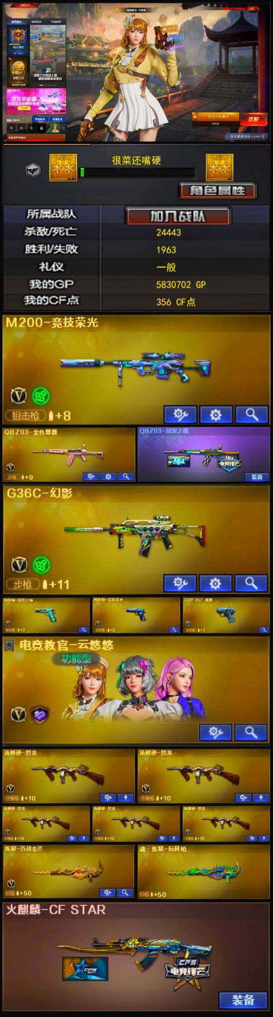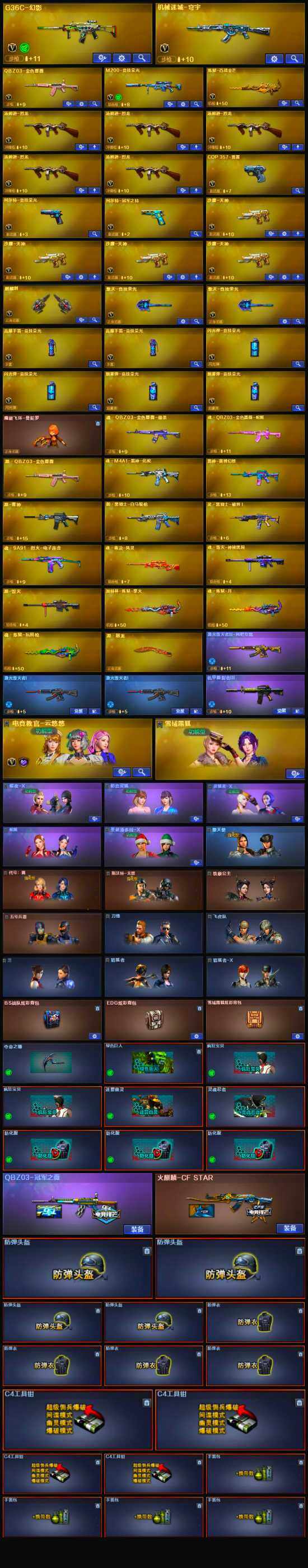 【英雄级武器】:G36C-幻影,死神-雪域霜狐,QBZ03-金色蔷薇,M200-竞技荣光,炼狱-百战金芒,汤姆逊-烈龙*5,沙鹰-天神*4,柯尔特-冠军之特,柯尔特-竞技荣光,麒麟刺,擎天-竞技荣光*2,麒麟刺-百战金芒,高爆手雷-竞技荣光*2,闪光弹-竞技荣光*2,烟雾弹-竞技荣光*2,M4A1-赤狱骑士