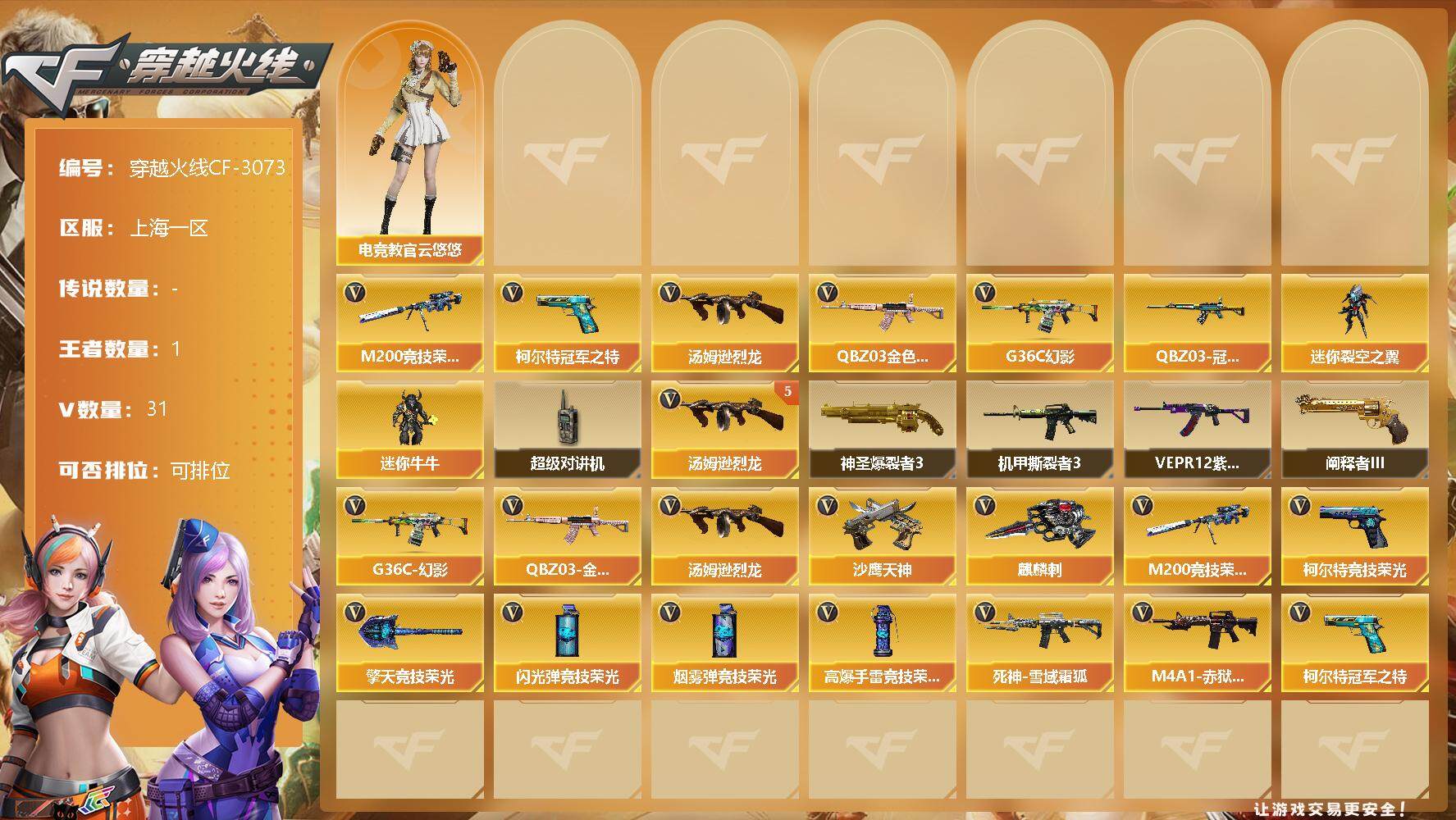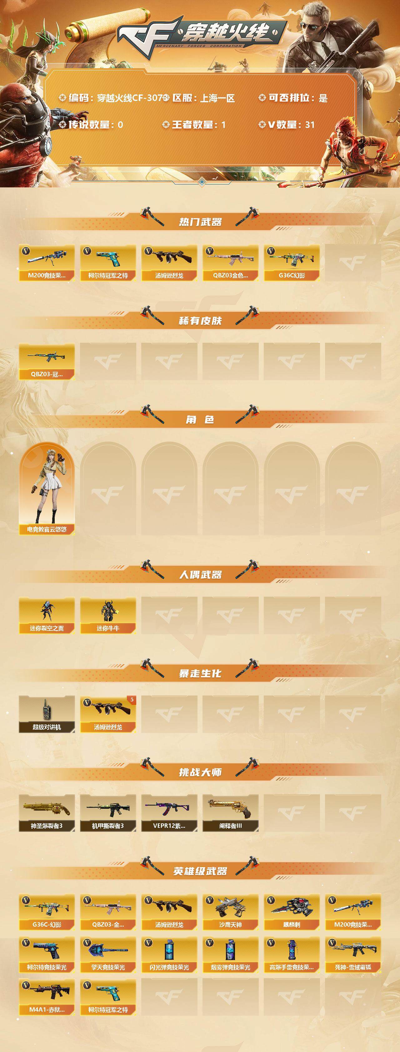 [13047409]上海一区-31V-1王者-0炫金 【热门武器】:G36C-幻影,QBZ03-金色蔷薇,M200-竞技荣光,柯尔特-冠军之特,汤姆逊-烈龙*5 【音效卡】:炼狱-百战金芒-庆典舞曲音效卡,死神-雪域霜狐-怀旧音效卡 【皮肤】:QBZ03-冠军之薇,M4A1-再燃火线,轻型军用手斧-再燃火线 【角色】:电竞教官-云悠悠 【人偶武器】:迷你裂空之翼*2,迷你牛牛 【暴走生化】:超级对讲机 【挑战大师】:神圣爆裂者III,VEPR-12-紫魔,机甲撕裂者III,阐释者III 【英雄级武器】:G36C-幻影,死神-雪域霜狐,QBZ03-金色蔷薇,M200-竞技荣光,炼狱-百战金芒,汤姆逊-烈龙*5,沙鹰-天神*4,柯尔特-冠军之特,柯尔特-竞技荣光,麒麟刺,擎天-竞技荣光*2,麒麟刺-百战金芒,高爆手雷-竞技荣光*2,闪光弹-竞技荣光*2,烟雾弹-竞技荣光*2,M4A1-赤狱骑士 【特殊枪械】:5烈龙