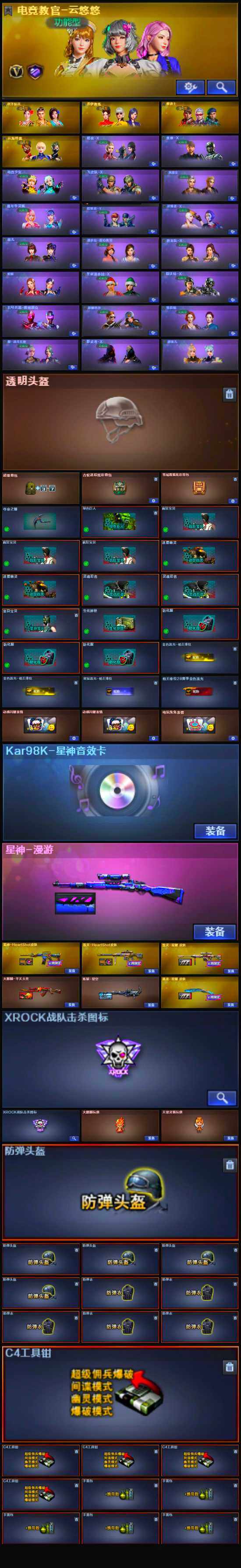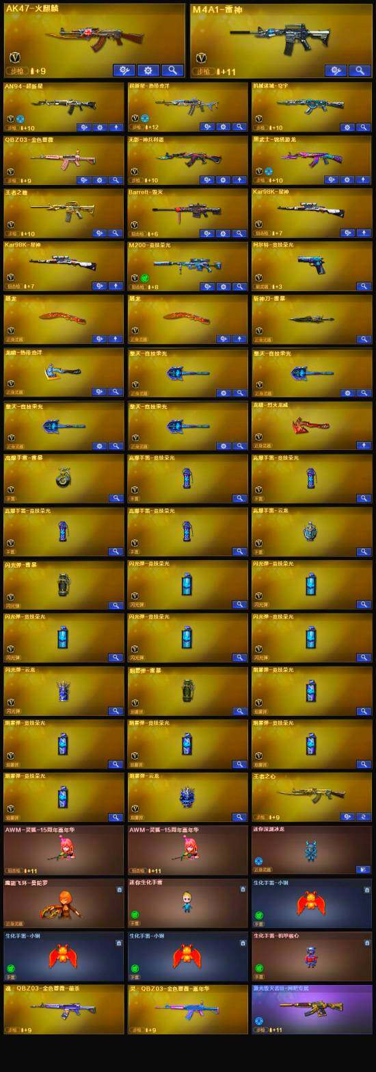 【英雄级武器】:AK47-火麒麟,M4A1-雷神,AN94-超新星,无影-神兵利器,黑武士-锦绣游龙,超新星-热带奇洋,QBZ03-独角-IV,QBZ03-金色蔷薇,王者之魄-觉醒版,Barrett-毁灭,Kar98K-星神*2,M200-竞技荣光,柯尔特-竞技荣光,屠龙*2,擎天-竞技荣光*4,龙啸-热带奇洋,斩神刀-雷暴,高爆手雷-雷暴,高爆手雷-竞技荣光*4,高爆手雷-云龙,手雷-热带奇洋,闪光弹-雷暴,闪光弹-竞技荣光*5,闪光弹-云龙,烟雾弹-雷暴,烟雾弹-竞技荣光*5,烟雾弹-云龙,M4A1-赤狱骑士