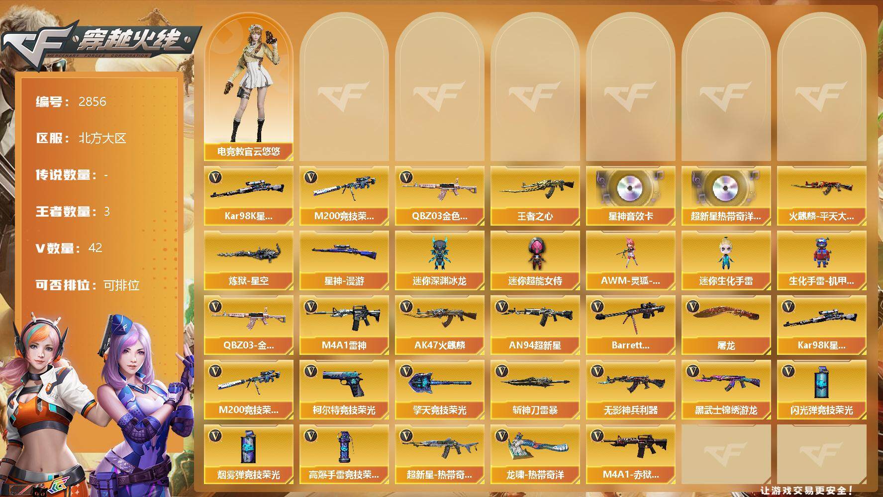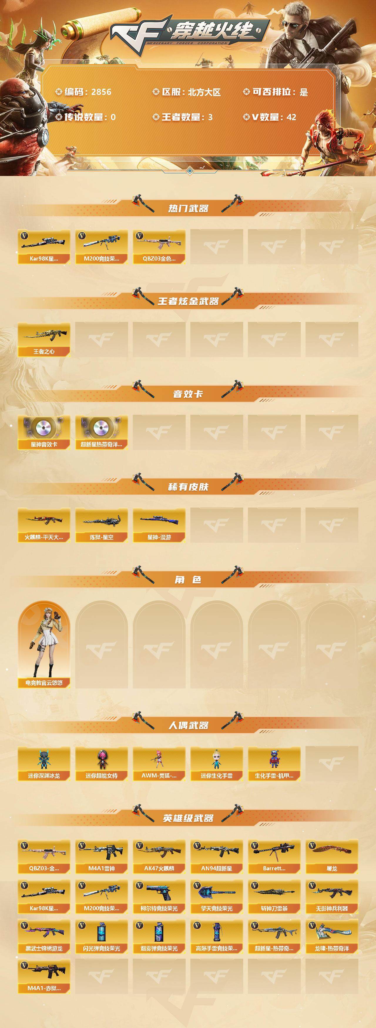 [13047466]北方大区-42V-3王者-0炫金 【热门武器】:QBZ03-金色蔷薇,M200-竞技荣光,Kar98K-星神*2 【王者炫金武器】:王者之心 【音效卡】:AN94-超新星-热带奇洋音效卡,Kar98K-星神音效卡,Barrett-碧霄极光音效卡*2 【皮肤】:星神-漫游,火麒麟-平天大圣,毁灭-星耀 皮肤,炼狱-星空,屠龙-星耀 皮肤 【角色】:电竞教官-云悠悠 【人偶武器】:AWM-灵狐-15周年嘉年华*2,迷你超能女侍,迷你深渊冰龙,迷你生化手雷,生化手雷-机甲核心 【英雄级武器】:AK47-火麒麟,M4A1-雷神,AN94-超新星,无影-神兵利器,黑武士-锦绣游龙,超新星-热带奇洋,QBZ03-独角-IV,QBZ03-金色蔷薇,王者之魄-觉醒版,Barrett-毁灭,Kar98K-星神*2,M200-竞技荣光,柯尔特-竞技荣光,屠龙*2,擎天-竞技荣光*4,龙啸-热带奇洋,斩神刀-雷暴,高爆手雷-雷暴,高爆手雷-竞技荣光*4,高爆手雷-云龙,手雷-热带奇洋,闪光弹-雷暴,闪光弹-竞技荣光*5,闪光弹-云龙,烟雾弹-雷暴,烟雾弹-竞技荣光*5,烟雾弹-云龙,M4A1-赤狱骑士 【特殊枪械】: