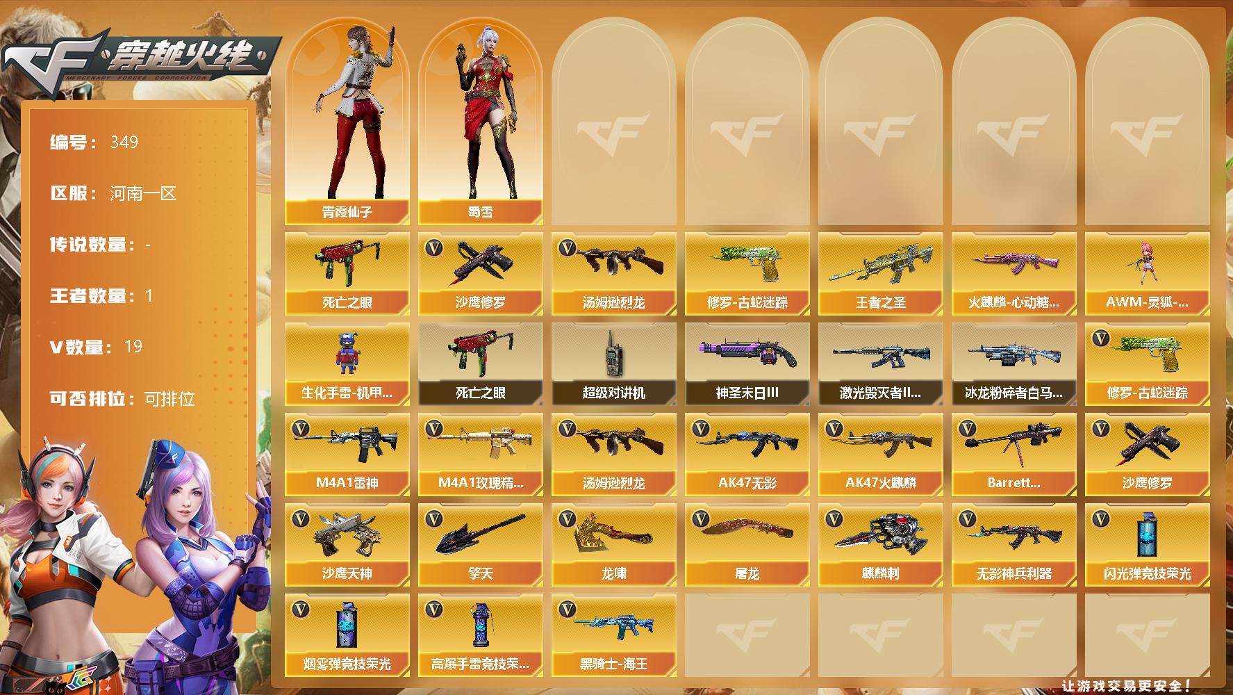 [13047830]河南一区-19V-1王者-0炫金 【热门武器】:修罗-古蛇迷踪,死亡之眼,汤姆逊-烈龙,沙鹰-修罗 【王者炫金武器】:王者之圣 【皮肤】:雷神-暗月,火麒麟-新春kwai乐,火麒麟-心动糖果,毁灭-航天科技皮肤,修罗-能量核心 【角色】:蜀雪,青霞仙子 【人偶武器】:AWM-灵狐-15周年嘉年华,生化手雷-机甲核心*3 【暴走生化】:死亡之眼,超级对讲机 【挑战大师】:冰龙粉碎者-白马银枪,激光毁灭者III-白马银枪,神圣爆裂者-末日III 【英雄级武器】:AK47-火麒麟,M4A1-雷神,AK47-无影,无影-神兵利器,M4A1-玫瑰精灵,黑骑士-海王,Barrett-毁灭,汤姆逊-烈龙,沙鹰-修罗,沙鹰-天神,修罗-古蛇迷踪,屠龙*2,龙啸,擎天,麒麟刺,高爆手雷-竞技荣光,高爆手雷-古蛇迷踪,闪光弹-竞技荣光,烟雾弹-竞技荣光,烟雾弹-古蛇迷踪 【特殊枪械】:1烈龙