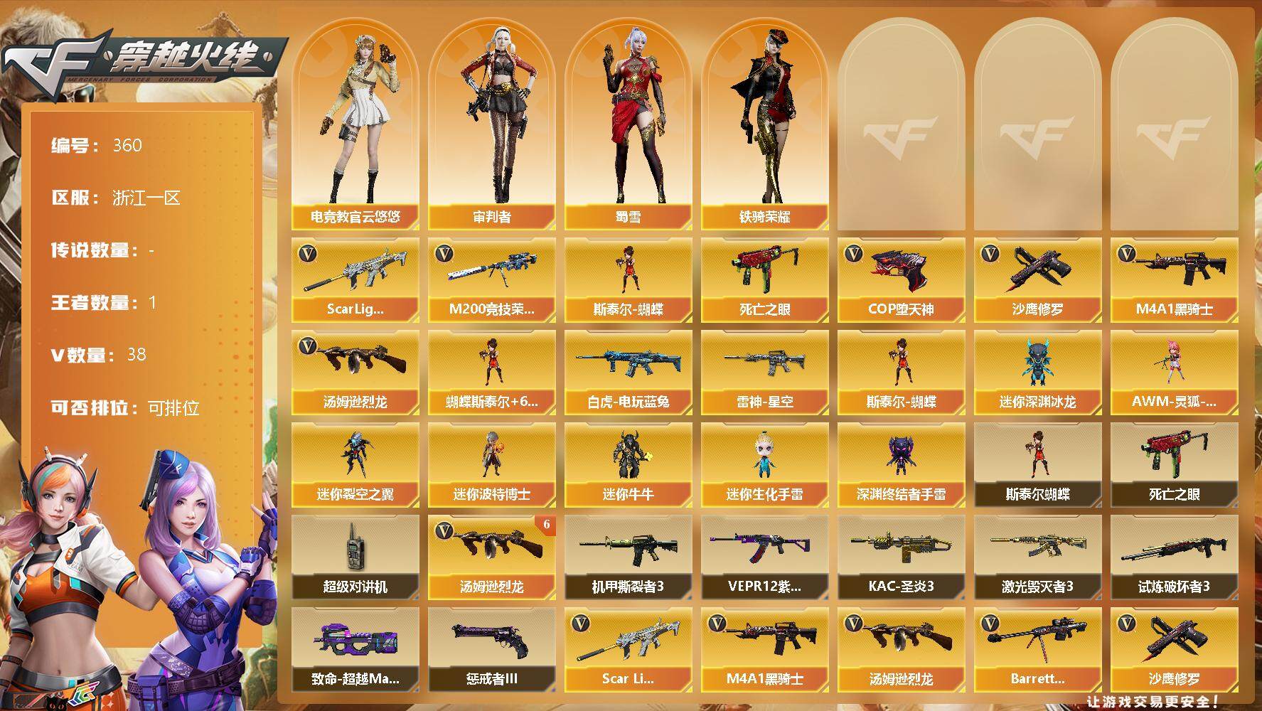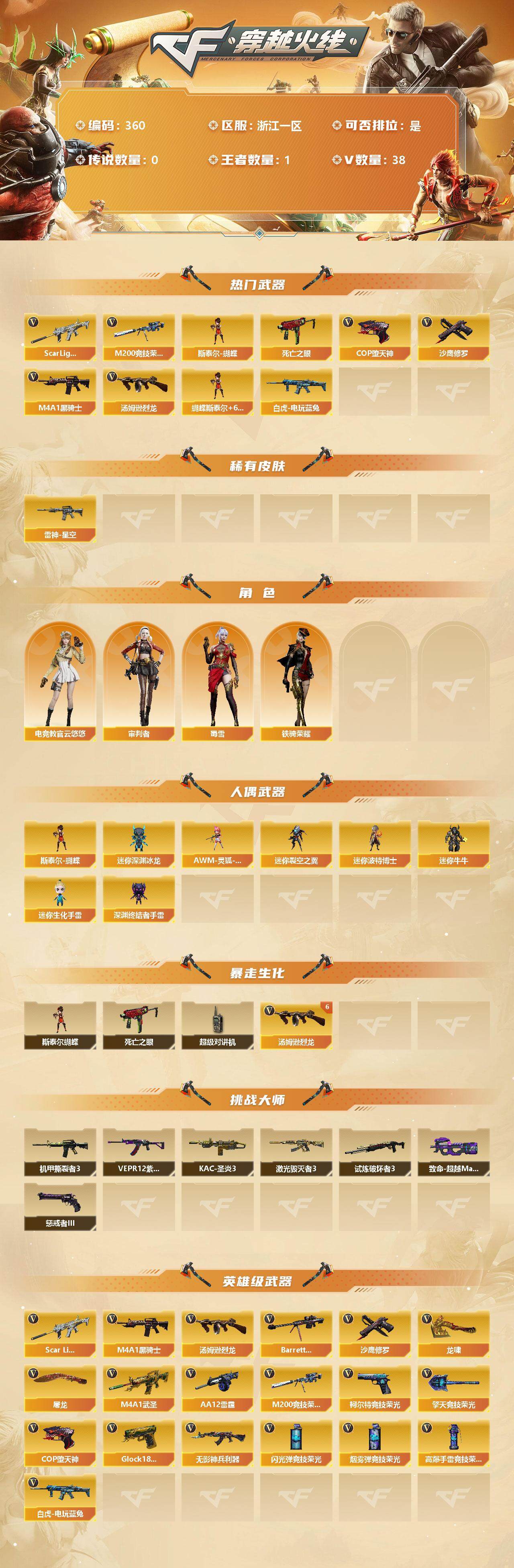 [13048372]浙江一区-38V-1王者-0炫金 【热门武器】:Scar Light-白虎,M200-竞技荣光,死亡之眼,白虎-电玩蓝兔,M4A1-黑骑士,汤姆逊-烈龙*7,斯泰尔-蝴蝶,COP-堕天神,沙鹰-修罗 【音效卡】:炼狱-百战金芒-庆典舞曲音效卡 【皮肤】:雷神-星空,M4A1-再燃火线,轻型军用手斧-再燃火线 【角色】:审判者,电竞教官-云悠悠,蜀雪,铁骑荣耀 【人偶武器】:斯泰尔-蝴蝶,AWM-灵狐-15周年嘉年华*2,迷你深渊冰龙,迷你裂空之翼*2,迷你波特博士*4,迷你牛牛,迷你生化手雷*2,深渊终结者手雷 【暴走生化】:斯泰尔-蝴蝶,死亡之眼,超级对讲机 【挑战大师】:致命乱世-超越Max,VEPR-12-紫魔,激光毁灭者III*3,机甲撕裂者III,试炼破坏者III,KAC-圣炎切割者III,惩戒者III 【英雄级武器】:M4A1-黑骑士,M4A1-武圣,Scar Light-白虎,无影-神兵利器,QBZ03-独角-III,白虎-电玩蓝兔,Barrett-毁灭,M200-竞技荣光,炼狱-百战金芒,汤姆逊-烈龙*7,AA-12-雷霆,沙鹰-修罗,COP-堕天神,柯尔特-竞技荣光,Glock18-武圣,屠龙,龙啸,擎天-竞技荣光,麒麟刺-百战金芒,高爆手雷-竞技荣光*2,闪光弹-竞技荣光*4,烟雾弹-竞技荣光*3 【特殊枪械】:蝴蝶斯泰尔+6烈龙,1白虎,1黑骑士,6烈龙,1蝴蝶斯泰尔