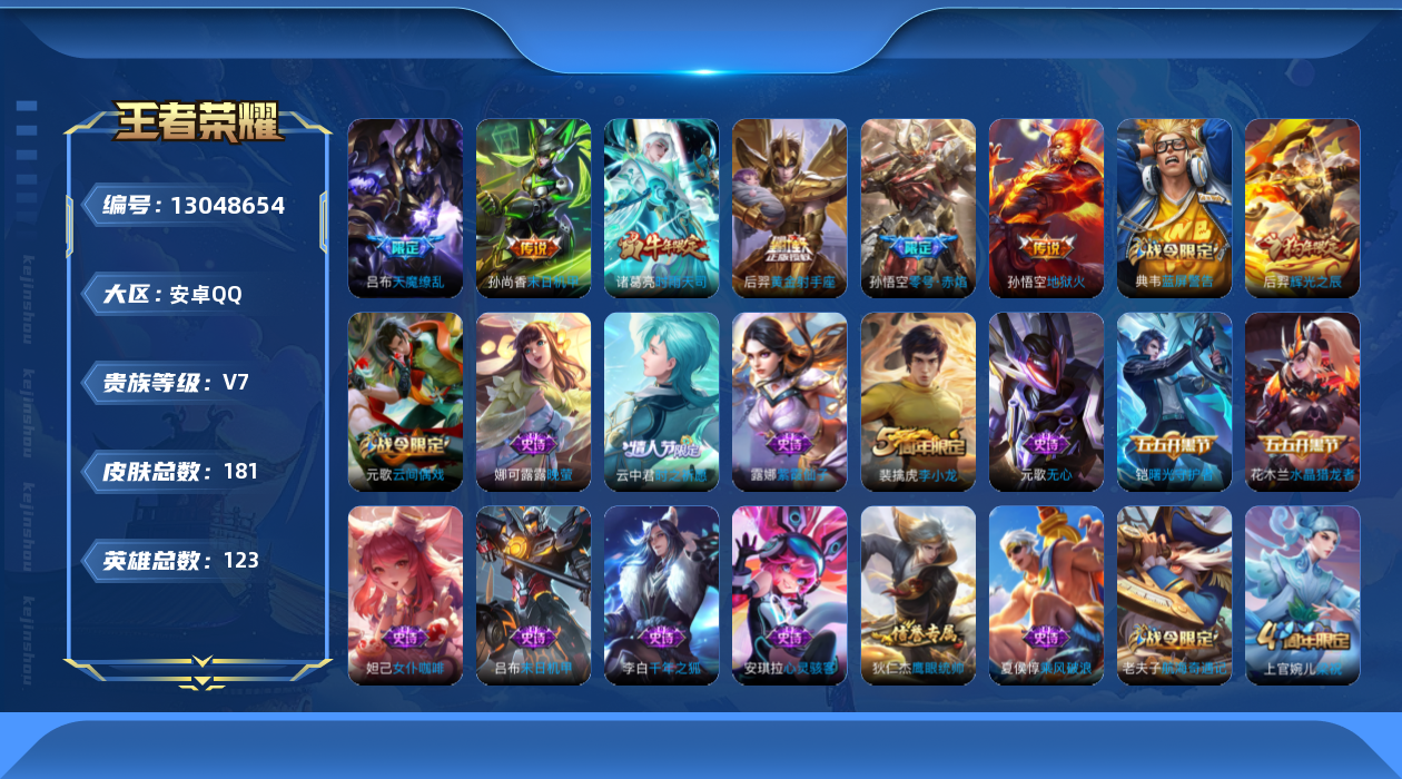 [13048654]安卓Q-V0-尊贵铂金III段位-123英雄-181皮肤-0典藏-0珍品无双-0无双-0珍品传说-6传说-40史诗