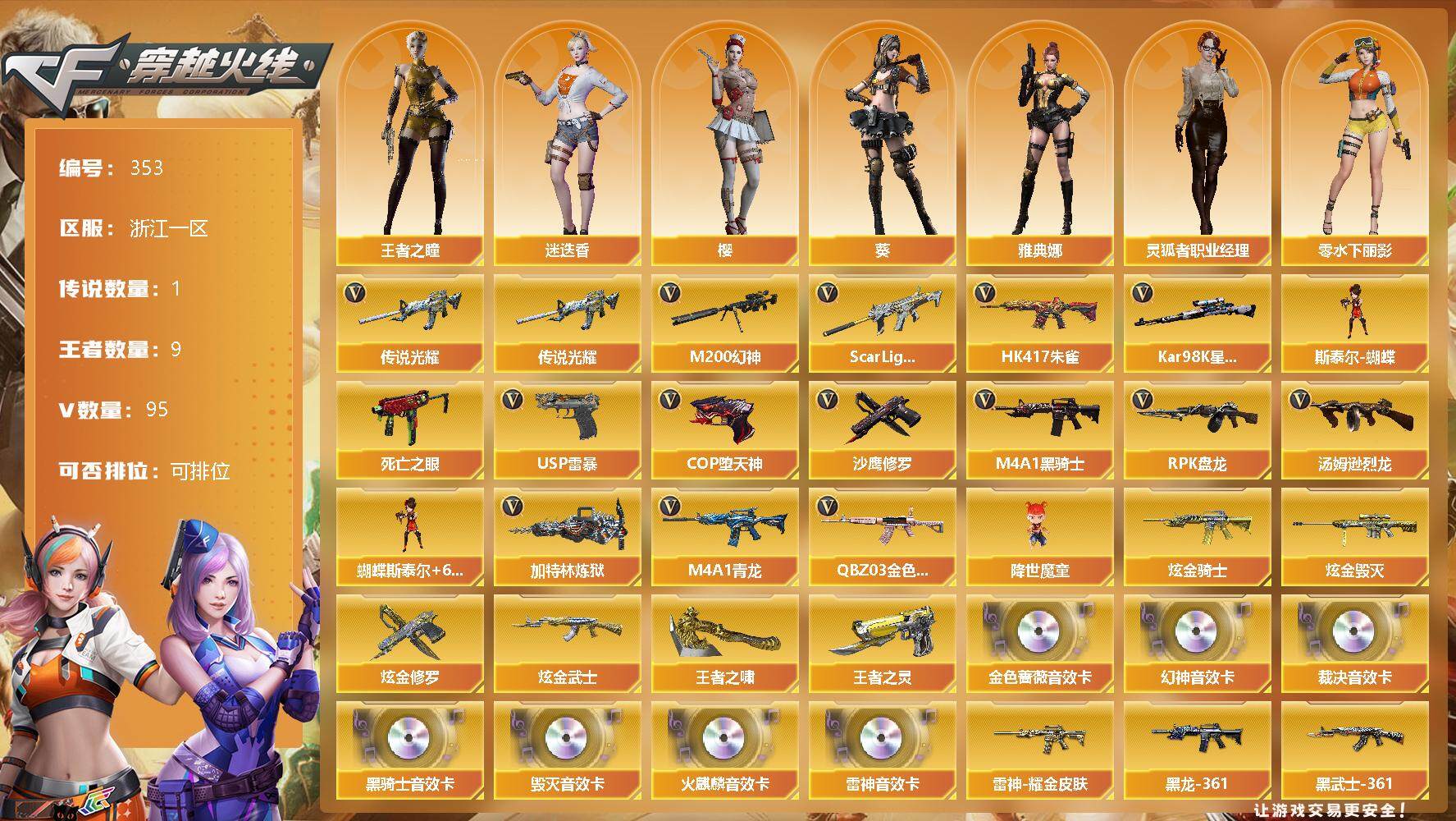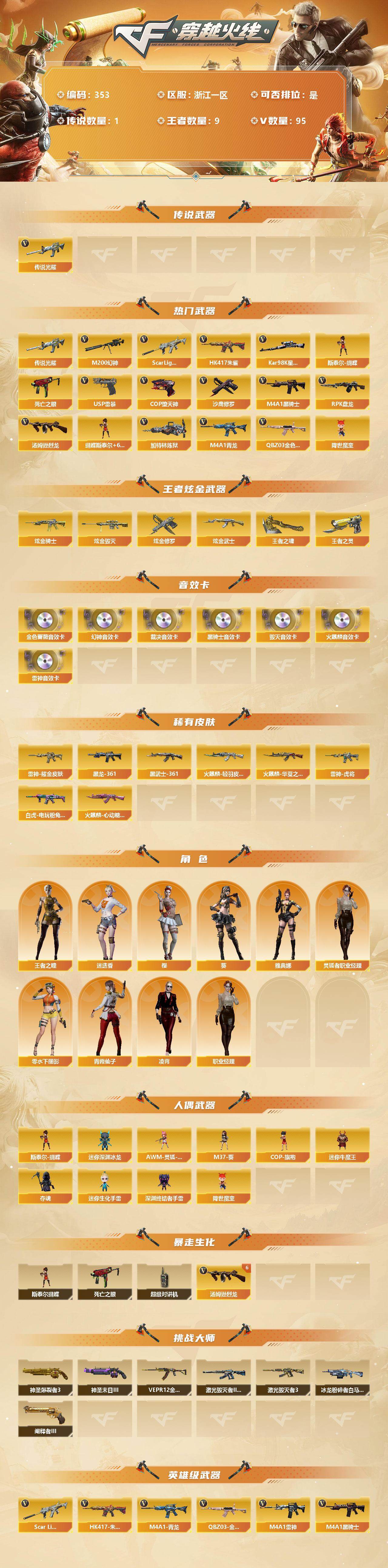 [13048647]浙江一区-95V-9王者-4炫金 【传说武器】:传说光耀 【热门武器】:传说光耀,QBZ03-金色蔷薇,Scar Light-白虎,HK417-朱雀,M4A1-青龙,M200-幻神,死亡之眼,Kar98K-星神,M4A1-黑骑士*2,汤姆逊-烈龙*6,RPK-盘龙*2,加特林-炼狱*2,斯泰尔-蝴蝶,降世魔童,USP-雷暴,COP-堕天神,沙鹰-修罗*2 【王者炫金武器】:王者之灵,王者之啸,炫金骑士,炫金毁灭,炫金修罗,炫金武士 【音效卡】:M200-幻神音效卡,AK47-火麒麟音效卡,M4A1-雷神音效卡,M4A1-黑骑士音效卡,Barrett-毁灭音效卡,QBZ03-金色蔷薇音效卡,AWM-裁决音效卡 【皮肤】:白虎-电玩粉兔皮肤,雷神-虎将,雷神-耀金皮肤,雷神-源计划2.0专属 皮肤,火麒麟-华夏之心,火麒麟-轻羽皮肤*3,火麒麟-心动糖果,M4A1-黑龙-361,AK47-黑武士-361,烈火-动感闪耀 皮肤 【角色】:葵,樱,迷迭香,凌霄,王者之瞳,雅典娜,灵狐者-职业经理*2,零-水下丽影,青霞仙子 【人偶武器】:斯泰尔-蝴蝶,降世魔童,AWM-灵狐-15周年嘉年华,M37-葵,COP-旗袍,迷你深渊冰龙,迷你牛魔王,夺魂*2,迷你生化手雷,深渊终结者手雷 【暴走生化】:斯泰尔-蝴蝶,死亡之眼,超级对讲机 【挑战大师】:神圣爆裂者III,冰龙粉碎者-白马银枪,激光毁灭者III-白马银枪,VEPR-12-金魔,激光毁灭者III*3,神圣爆裂者-末日III*2,阐释者III 【英雄级武器】:AK47-火麒麟*2,M4A1-雷神,M4A1-黑骑士*2,AK47-黑武士,AK12-天启*3,AK47-黑鲨*2,M4A1-龙血*2,M4A1-青龙,HK417-朱雀,Scar Light-白虎,M4A1-夜魔,无影-神兵利器,QBZ03-金色蔷薇,M4A1-猎神,王者之魄-觉醒版,超新星-悦享-觉醒版,王者冰魄-觉醒版,黑骑士-海王,Barrett-毁灭,Barrett-极光,AWM-裁决,M200-幻神,Kar98K-星神,王者之怒-觉醒版,王者幻神-觉醒版,RPK-盘龙*2,加特林-炼狱*2,汤姆逊-烈龙*6,AA-12-雷霆,沙鹰-修罗*2,沙鹰-天神,USP-雷暴,COP-堕天神,破空枪刃-夜魔*2,屠龙*2,龙啸*5,马来剑-夜魔,擎天,麒麟刺,斩神