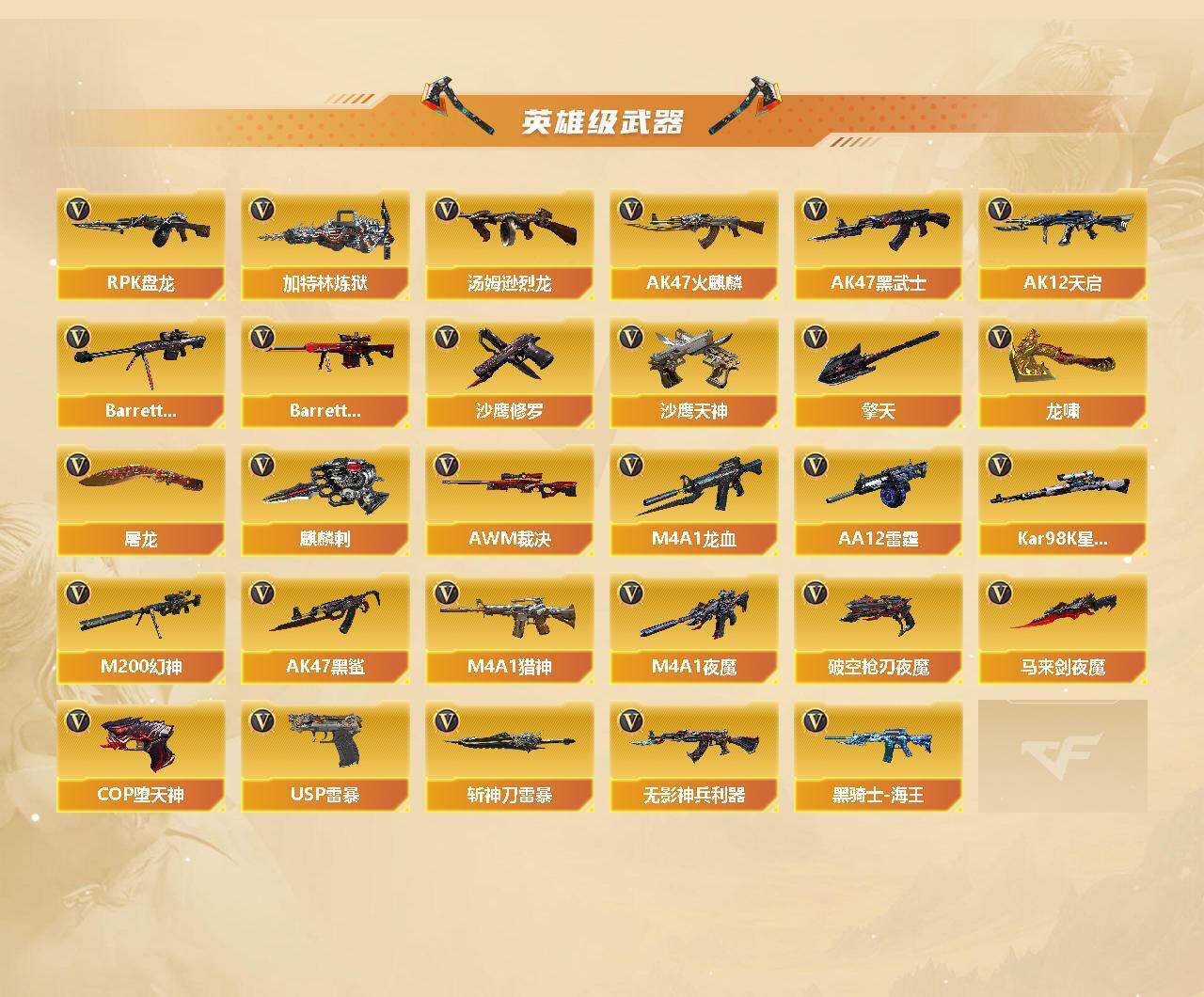 【英雄级武器】:AK47-火麒麟*2,M4A1-雷神,M4A1-黑骑士*2,AK47-黑武士,AK12-天启*3,AK47-黑鲨*2,M4A1-龙血*2,M4A1-青龙,HK417-朱雀,Scar Light-白虎,M4A1-夜魔,无影-神兵利器,QBZ03-金色蔷薇,M4A1-猎神,王者之魄-觉醒版,超新星-悦享-觉醒版,王者冰魄-觉醒版,黑骑士-海王,Barrett-毁灭,Barrett-极光,AWM-裁决,M200-幻神,Kar98K-星神,王者之怒-觉醒版,王者幻神-觉醒版,RPK-盘龙*2,加特林-炼狱*2,汤姆逊-烈龙*6,AA-12-雷霆,沙鹰-修罗*2,沙鹰-天神,USP-雷暴,COP-堕天神,破空枪刃-夜魔*2,屠龙*2,龙啸*5,马来剑-夜魔,擎天,麒麟刺,斩神