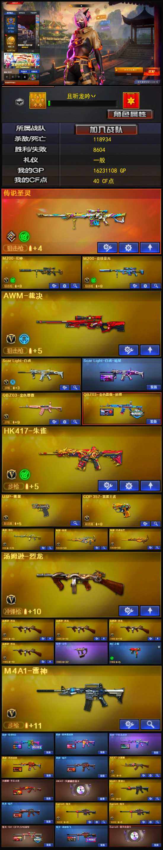 【皮肤】:Scar Light-白虎-暗星,QBZ03-金色蔷薇-拼搏,雷神-暗月,雷神-传奇N9,雷神-烈虎皮肤,雷神-宇航兔皮肤,雷神-维纳斯皮肤,M4A1-再燃火线,火麒麟-平天大圣,毁灭-SV-CFPLS16冠军,毁灭-战神张飞,M4A1-千变-孔明皮肤,黑龙-暗月,无影-暗月,无影-能量核心,AK47-B-常胜将军-曹操*2,修罗-星空,天神-暗月*3,轻型军用手斧-再燃火线