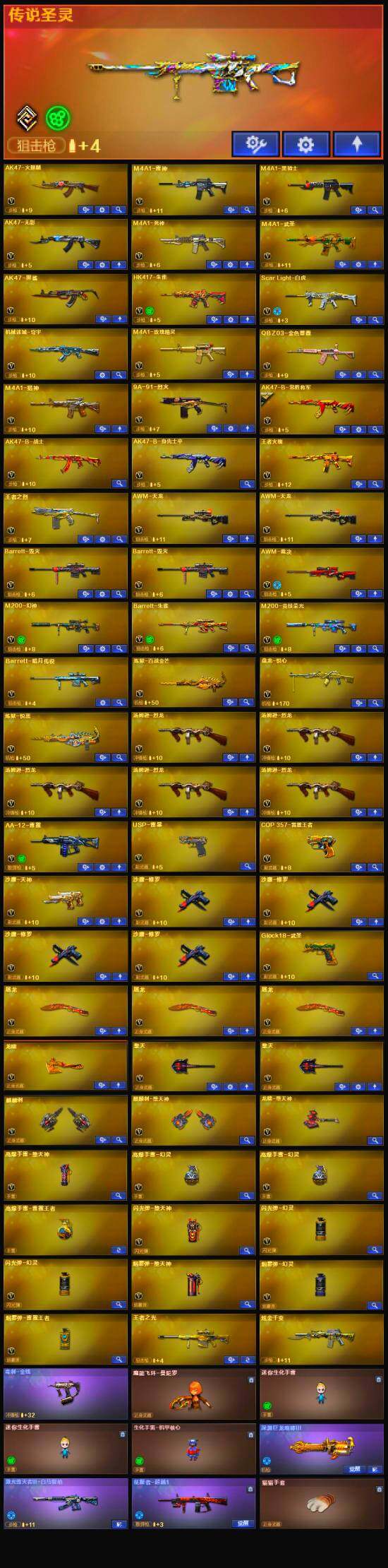 【热门武器】:传说圣灵,QBZ03-金色蔷薇,Scar Light-白虎,HK417-朱雀,M200-幻神,M200-竞技荣光,死亡之眼,王者炎心,金色小号,M4A1-黑骑士,汤姆逊-烈龙*5,羊驼玩偶,USP-雷暴,沙鹰-修罗*4