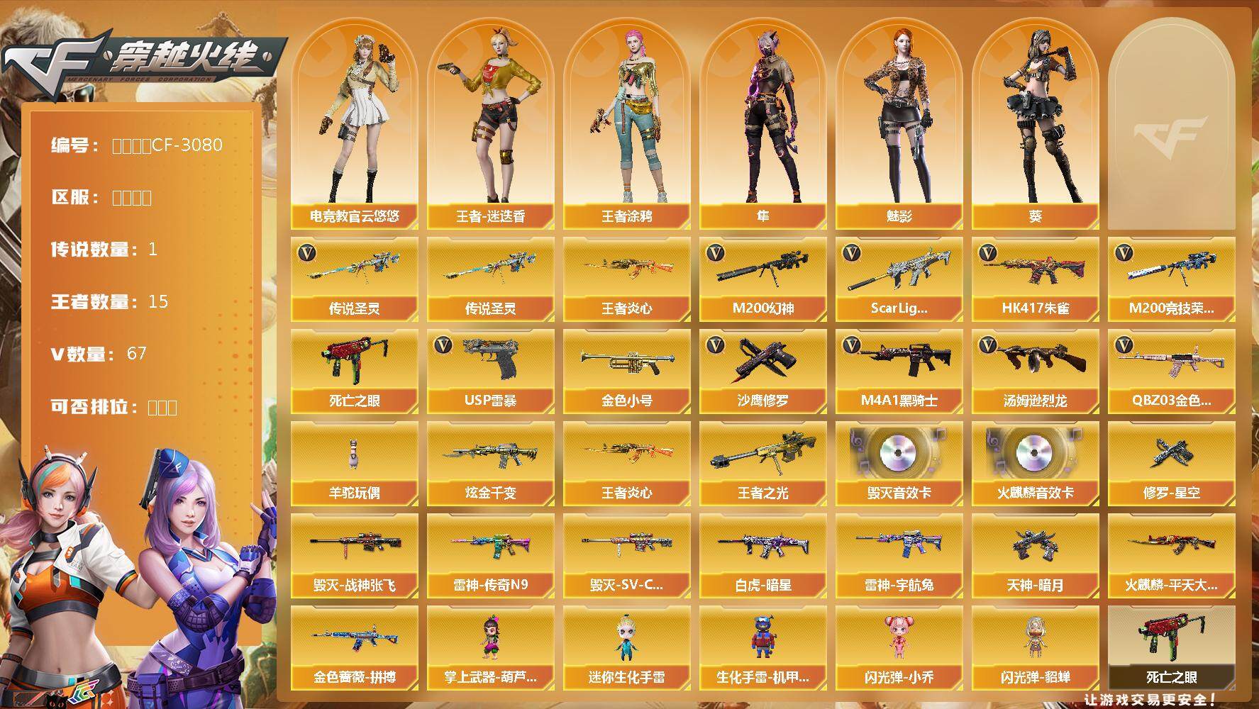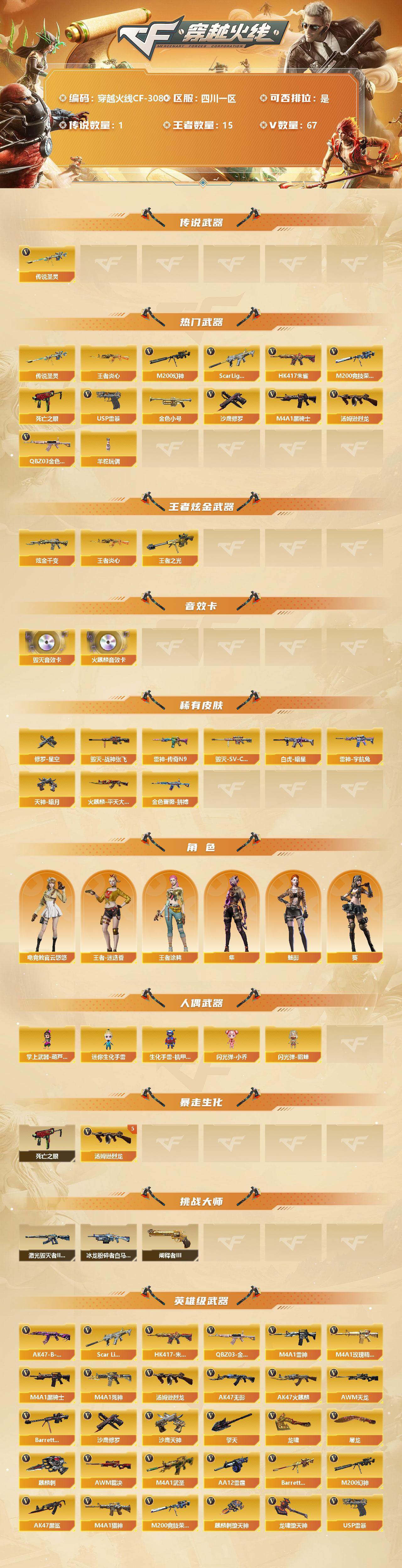 [13049388]四川一区-67V-15王者-1炫金 【传说武器】:传说圣灵 【热门武器】:传说圣灵,QBZ03-金色蔷薇,Scar Light-白虎,HK417-朱雀,M200-幻神,M200-竞技荣光,死亡之眼,王者炎心,金色小号,M4A1-黑骑士,汤姆逊-烈龙*5,羊驼玩偶,USP-雷暴,沙鹰-修罗*4 【王者炫金武器】:王者炎心,王者之光,炫金千变 【音效卡】:AK47-火麒麟音效卡,Barrett-毁灭音效卡,白虎-盛典舞曲音效卡,炼狱-百战金芒-庆典舞曲音效卡 【皮肤】:Scar Light-白虎-暗星,QBZ03-金色蔷薇-拼搏,雷神-暗月,雷神-传奇N9,雷神-烈虎皮肤,雷神-宇航兔皮肤,雷神-维纳斯皮肤,M4A1-再燃火线,火麒麟-平天大圣,毁灭-SV-CFPLS16冠军,毁灭-战神张飞,M4A1-千变-孔明皮肤,黑龙-暗月,无影-暗月,无影-能量核心,AK47-B-常胜将军-曹操*2,修罗-星空,天神-暗月*3,轻型军用手斧-再燃火线 【角色】:葵,魅影,电竞教官-云悠悠,隼,王者涂鸦,王者-迷迭香 【人偶武器】:掌上武器-葫芦兄弟,迷你生化手雷*2,生化手雷-机甲核心,闪光弹-小乔,闪光弹-貂蝉 【暴走生化】:死亡之眼 【挑战大师】:冰龙粉碎者-白马银枪,激光毁灭者III-白马银枪,阐释者III 【英雄级武器】:AK47-火麒麟,M4A1-雷神,M4A1-黑骑士,AK47-无影,M4A1-死神,M4A1-武圣,AK47-黑鲨,HK417-朱雀,Scar Light-白虎,QBZ03-独角-IV,M4A1-玫瑰精灵,QBZ03-金色蔷薇,M4A1-猎神,AK-47-猩红传说,王者火魄-觉醒版,AK47-B-常胜将军,王者之烈-觉醒版,AWM-天龙*2,Barrett-毁灭*2,AWM-裁决,M200-幻神,Barrett-朱雀,M200-竞技荣光,炼狱-百战金芒,盘龙-悦心-觉醒版,炼狱-悦蓝-觉醒版,汤姆逊-烈龙*5,AA-12-雷霆,沙鹰-修罗*4,沙鹰-天神,USP-雷暴,COP 357-雷霆王者-觉醒版,Glock18-武圣,屠龙*3,龙啸,麒麟刺-堕天神,擎天*2,麒麟刺,龙啸-堕天神,麒麟刺-百战金芒,高爆手雷-堕天神,高爆手雷-幻灵*2,高爆手雷-雷霆王者,闪光弹-堕天神,闪光弹-幻灵*2,烟雾弹-堕天神,烟雾弹-幻灵,Barrett-碧霄极光 【