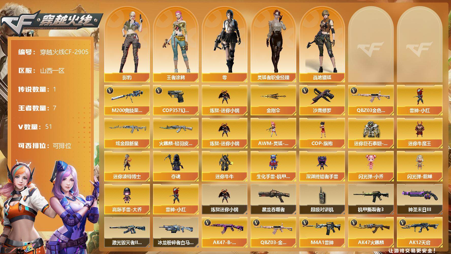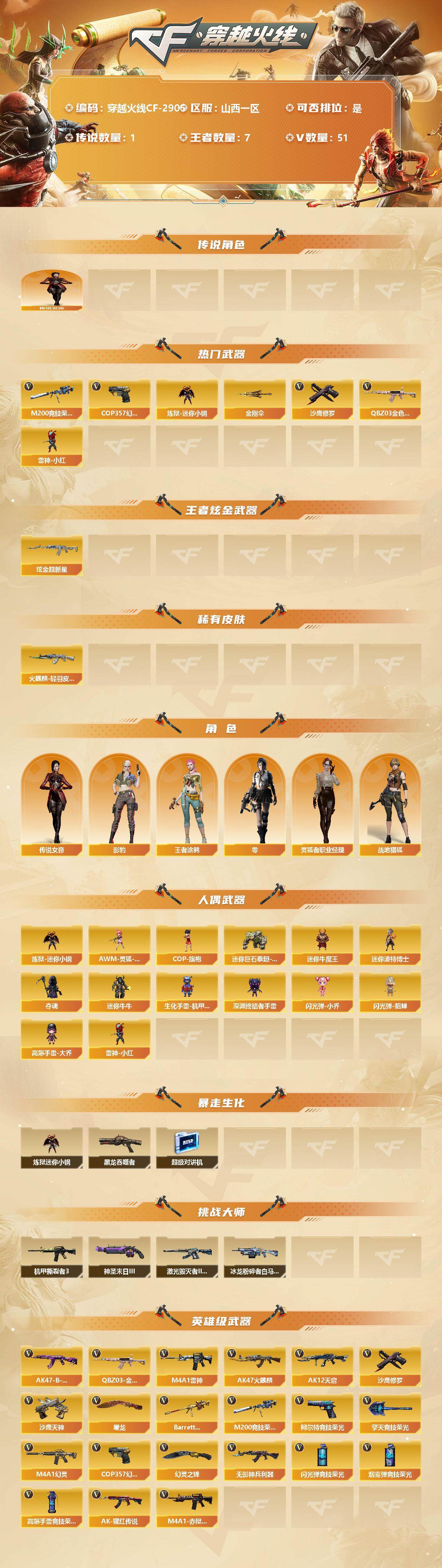 [13050648]山西一区-51V-7王者-1炫金 【传说角色】:传说女帝 【热门武器】:QBZ03-金色蔷薇,M200-竞技荣光,炼狱-迷你小钢,雷神-小红,COP 357-幻灵,沙鹰-修罗*2,金刚伞 【王者炫金武器】:炫金超新星 【稀有皮肤】:火麒麟-轻羽皮肤 【角色】:传说女帝,王者涂鸦,灵狐者-职业经理,零,影豹,战地猎狐 【人偶武器】:雷神-小红,AWM-灵狐-15周年嘉年华,COP-旗袍,炼狱-迷你小钢,迷你巨石泰坦-魔花研究所,迷你牛魔王,迷你波特博士,夺魂,迷你牛牛,生化手雷-机甲核心*2,深渊终结者手雷,闪光弹-小乔,闪光弹-貂蝉,高爆手雷-大乔 【暴走生化】:炼狱-迷你小钢,黑龙吞噬者,超级对讲机 【挑战大师】:机甲撕裂者III,神圣爆裂者-末日III,激光毁灭者III-白马银枪,冰龙粉碎者-白马银枪 【英雄级武器】:M200-竞技荣光,柯尔特-竞技荣光,擎天-竞技荣光,高爆手雷-竞技荣光,烟雾弹-竞技荣光,闪光弹-竞技荣光,M4A1-幻灵,COP 357-幻灵,幻灵之锋*4,QBZ03-金色蔷薇,无影-神兵利器,M4A1-雷神,AK47-火麒麟,AK12-天启,Barrett-朱雀,AK-47-猩红传说,AK47-B-常胜将军,M4A1-赤狱骑士,沙鹰-天神,沙鹰-修罗*2,屠龙*2 【特殊枪械】: