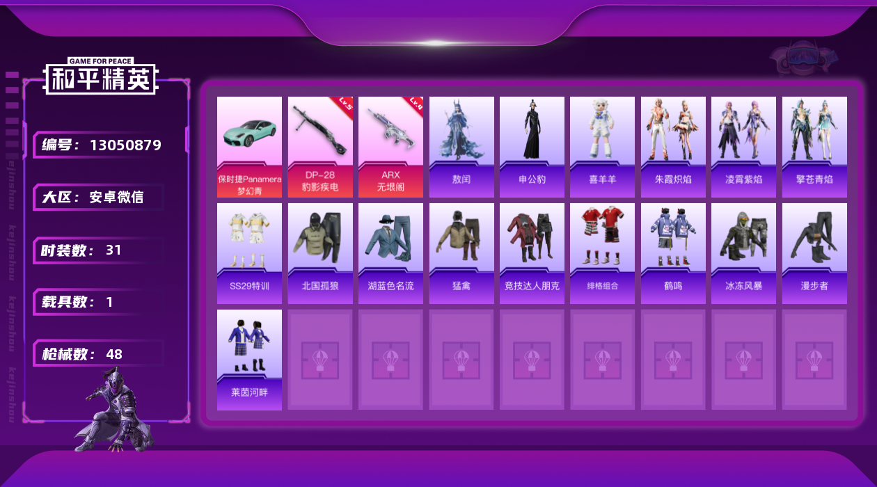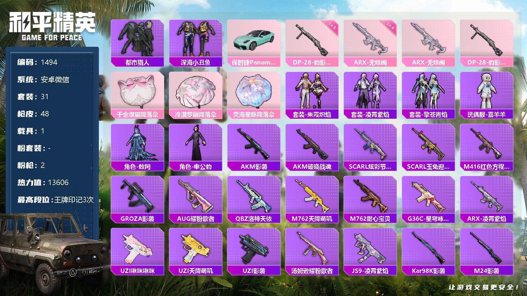 [13050879]安卓 微信-0粉装-2特效枪-1载具-0粉色飞行器-13606热力值-3王牌印记-31套装-48枪皮