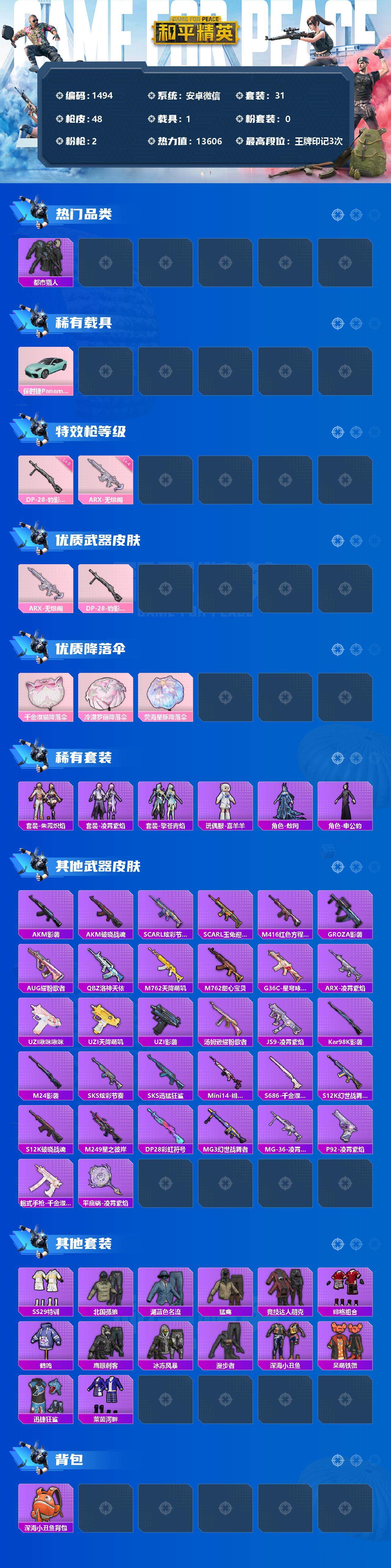 [13050879]安卓 微信-0粉装-2特效枪-1载具-0粉色飞行器-13606热力值-3王牌印记-31套装-48枪皮 【热门品类】:套装-都市猎人,套装-深海小丑鱼 【粉色载具】:保时捷Panamera(梦幻青) 【粉色枪皮等级】:ARX-无垠阁(四级),DP-28-豹影疾电(五级) 【粉色枪皮】:ARX-无垠阁,DP-28-豹影疾电 【粉色降落伞】:千金淑猫降落伞,冷漠罗丽降落伞,荧海星豚降落伞 【稀有套装】:套装-朱霞炽焰,套装-凌霄紫焰,套装-擎苍青焰,玩偶服-喜羊羊,角色-敖闰,角色-申公豹 【稀有枪皮】:AKM-影袭,AKM-破晓战魂,SCAR-L-炫彩节奏,SCAR-L-玉兔迎春,M416-红色方程式,GROZA-影袭,AUG-耀粉歌者,QBZ-洛神天依,M762-天降萌叽,M762-甜心宝贝,G36C-星穹咏叹调,ARX-凌霄紫焰,UZI-啾咪啾咪,UZI-天降萌叽,UZI-影袭,汤姆逊-耀粉歌者,JS9-凌霄紫焰,Kar98K-影袭,M24-影袭,SKS-炫彩节奏,SKS-迅猛狂鲨,Mini14-绯穹魔姬,S686-千金淑猫,S12K-破晓战魂,S12K-幻世战舞者,M249-星之彼岸,DP-28-彩虹符号,MG3-幻世战舞者,MG-36-凌霄紫焰,P92-凌霄紫焰,蝎式手枪-千金淑猫,平底锅-凌霄紫焰 【其他套装】:套装-SS29特训,套装-北国孤狼,套装-湖蓝色名流,套装-猛禽,套装-竞技达人朋克,套装-绯格组合,套装-鹤鸣,套装-鹰眼刺客,套装-冰冻风暴,套装-漫步者,套装-深海小丑鱼,套装-呆萌铁蟹,套装-迅捷狂鲨,套装-莱茵河畔 【稀有背包】:深海小丑鱼背包(3级) 【营地ID】:1023727786