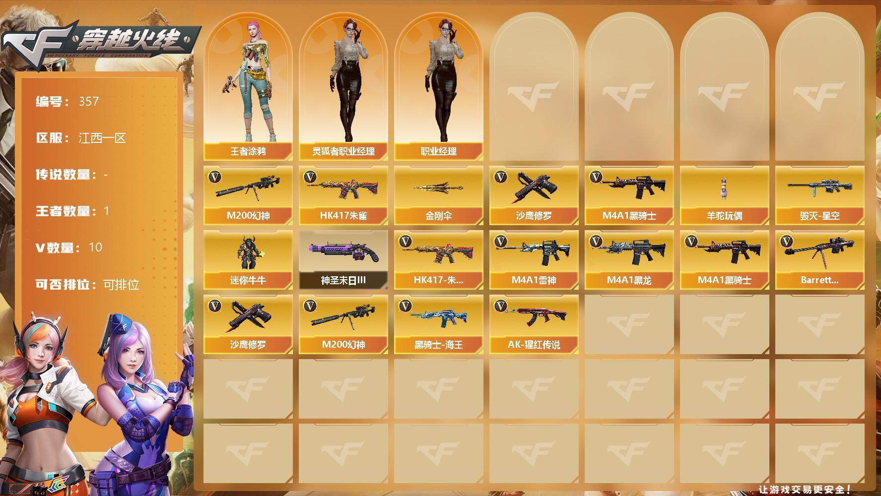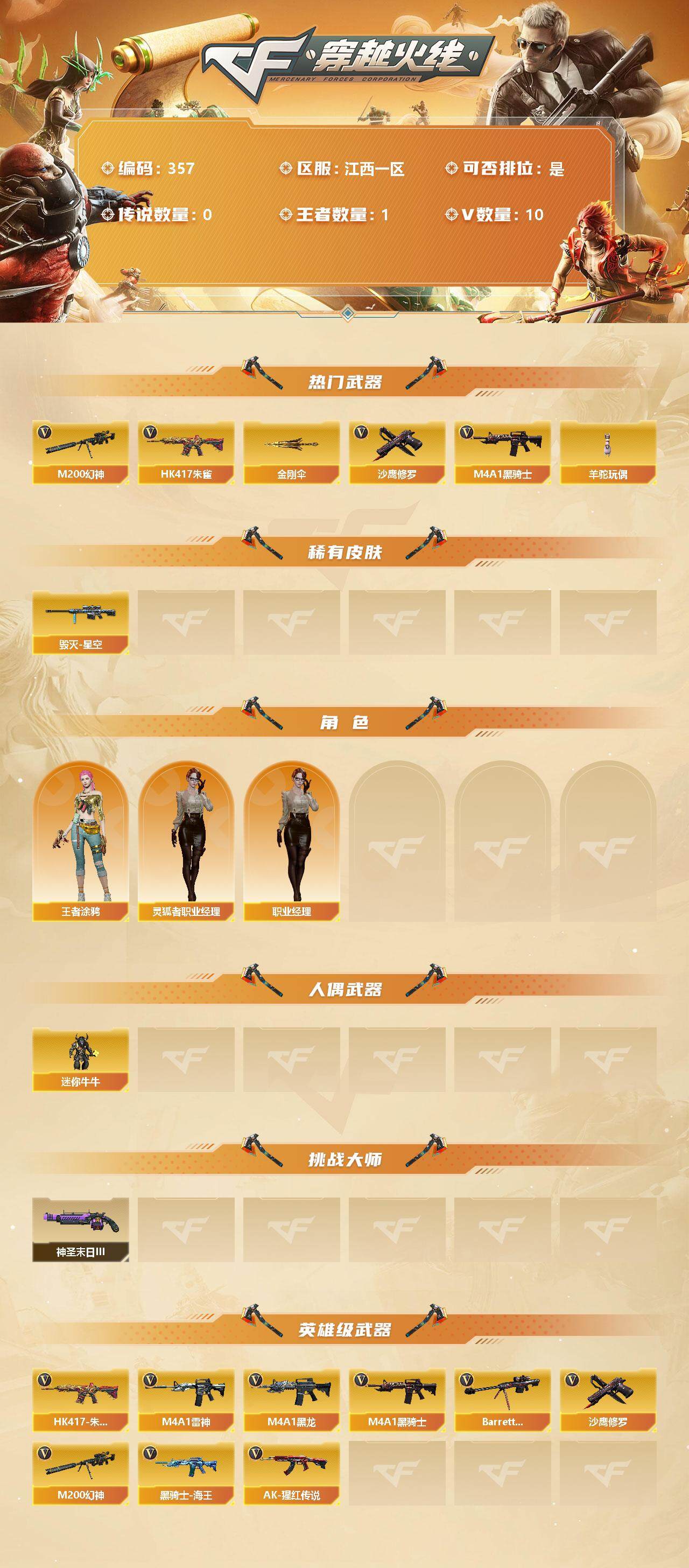[13052460]江西一区-10V-1王者-0炫金 【热门武器】:HK417-朱雀,M200-幻神,M4A1-黑骑士,羊驼玩偶,沙鹰-修罗,金刚伞 【皮肤】:毁灭-星空,黑龙-能量核心,战神-粉色甜心皮肤 【角色】:王者涂鸦,灵狐者-职业经理*2 【人偶武器】:迷你牛牛 【挑战大师】:神圣爆裂者-末日III 【英雄级武器】:M4A1-黑龙,M4A1-雷神,M4A1-黑骑士,HK417-朱雀,AK-47-猩红传说,黑骑士-海王,Barrett-毁灭*2,M200-幻神,沙鹰-修罗 【特殊枪械】:1黑骑士