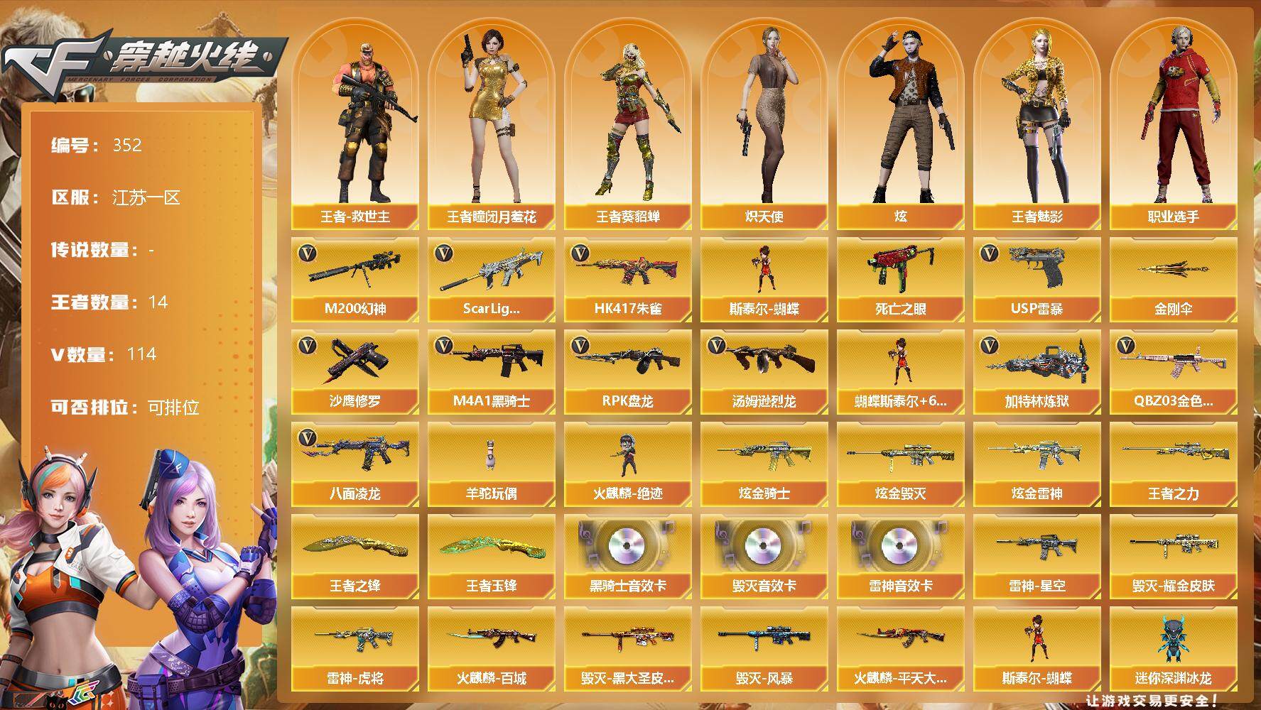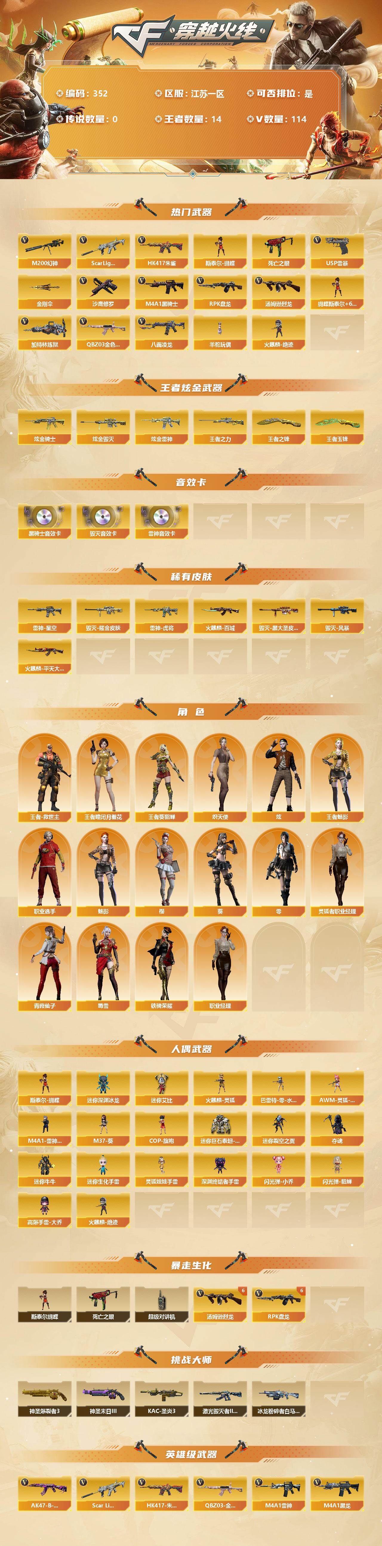 [13052469]江苏一区-114V-14王者-4炫金 【热门武器】:QBZ03-金色蔷薇*2,Scar Light-白虎,HK417-朱雀,M200-幻神,八面凌龙,死亡之眼,M4A1-黑骑士*3,汤姆逊-烈龙*6,RPK-盘龙*6,加特林-炼狱*2,斯泰尔-蝴蝶,羊驼玩偶,火麒麟-绝迹,USP-雷暴,沙鹰-修罗*4,金刚伞 【王者炫金武器】:王者之力,王者之锋,王者玉锋,炫金骑士*2,炫金毁灭,炫金雷神 【音效卡】:M4A1-雷神音效卡,M4A1-黑骑士音效卡,Barrett-毁灭音效卡,炼狱-百战金芒-庆典舞曲音效卡 【皮肤】:雷神-暗月,雷神-星空*2,雷神-虎将,雷神-烈虎皮肤,M4A1-再燃火线,火麒麟-雷神,火麒麟-平天大圣,火麒麟-百城,毁灭耀金皮肤,毁灭-黑大圣皮肤*3,毁灭-风暴,M4A1-千变-孔明皮肤,黑龙-能量核心,黑龙-暗月,天启-暗月,AK47-B-常胜将军-刘备*2,AK47-B-常胜将军-孙权*2,极光-能量核心,轻型军用手斧-再燃火线 【角色】:零,葵,樱,魅影,炫,王者-瞳-闭月羞花,王者-葵-貂蝉,王者-魅影,王者-救世主,灵狐者-职业经理*2,蜀雪,炽天使,铁骑荣耀,职业选手,青霞仙子 【人偶武器】:火麒麟-绝迹,火麒麟-灵狐,M4A1-雷神-精英刀锋,斯泰尔-蝴蝶,巴雷特-零-水下丽影,AWM-灵狐-15周年嘉年华,M37-葵,COP-旗袍,迷你艾比,迷你巨石泰坦-魔花研究所,迷你深渊冰龙,迷你裂空之翼,夺魂,迷你牛牛,迷你生化手雷*2,灵狐娃娃手雷*2,深渊终结者手雷,闪光弹-小乔,闪光弹-貂蝉,高爆手雷-大乔 【暴走生化】:斯泰尔-蝴蝶,死亡之眼,超级对讲机 【挑战大师】:神圣爆裂者III,冰龙粉碎者-白马银枪,激光毁灭者III-白马银枪,KAC-圣炎切割者III,神圣爆裂者-末日III 【英雄级武器】:M4A1-千变*2,AK47-火麒麟*2,M4A1-黑龙*2,M4A1-雷神*2,M4A1-黑骑士*3,AK47-黑武士,AK12-天启,AN94-超新星,M4A1-武圣,AK47-机械迷城*2,AK47-黑鲨*2,AK47-雷暴,HK417-朱雀,Scar Light-白虎,无影-神兵利器,八面凌龙,M4A1-玫瑰精灵,QBZ03-金色蔷薇*2,王者之幻-觉醒版,黑骑士-海王*3,AK47-B-常胜将军,AWM-天龙,Barrett