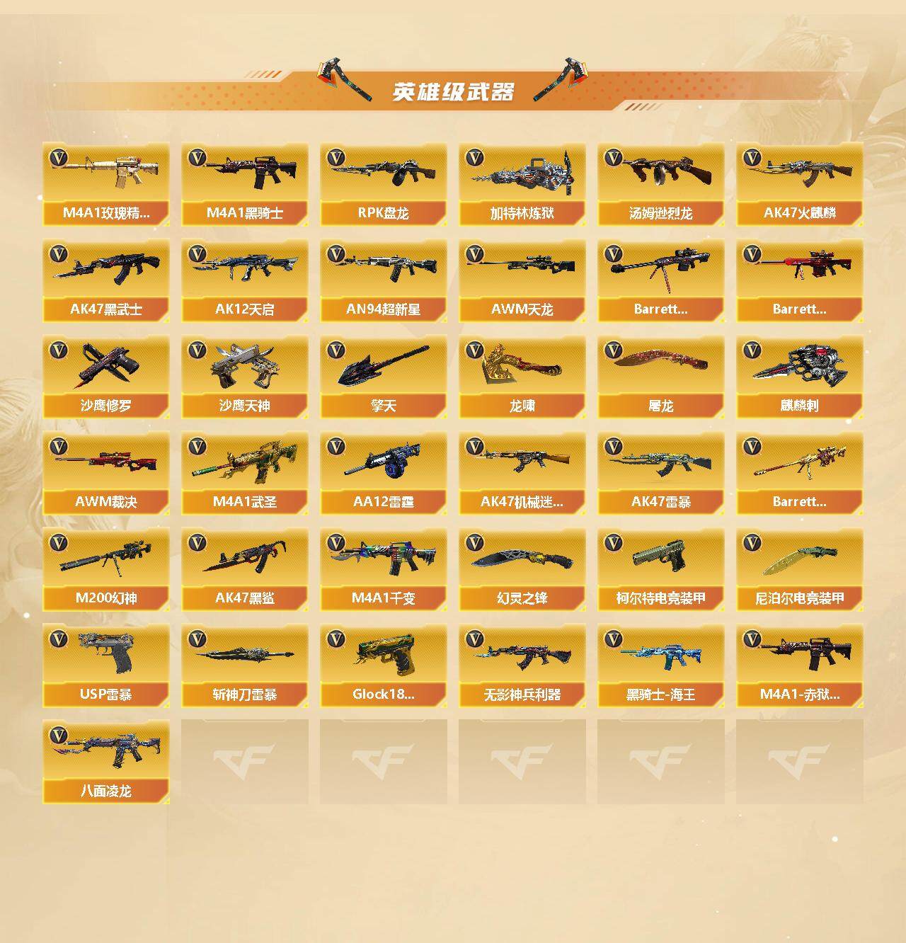 【英雄级武器】:M4A1-千变*2,AK47-火麒麟*2,M4A1-黑龙*2,M4A1-雷神*2,M4A1-黑骑士*3,AK47-黑武士,AK12-天启,AN94-超新星,M4A1-武圣,AK47-机械迷城*2,AK47-黑鲨*2,AK47-雷暴,HK417-朱雀,Scar Light-白虎,无影-神兵利器,八面凌龙,M4A1-玫瑰精灵,QBZ03-金色蔷薇*2,王者之幻-觉醒版,黑骑士-海王*3,AK47-B-常胜将军,AWM-天龙,Barrett