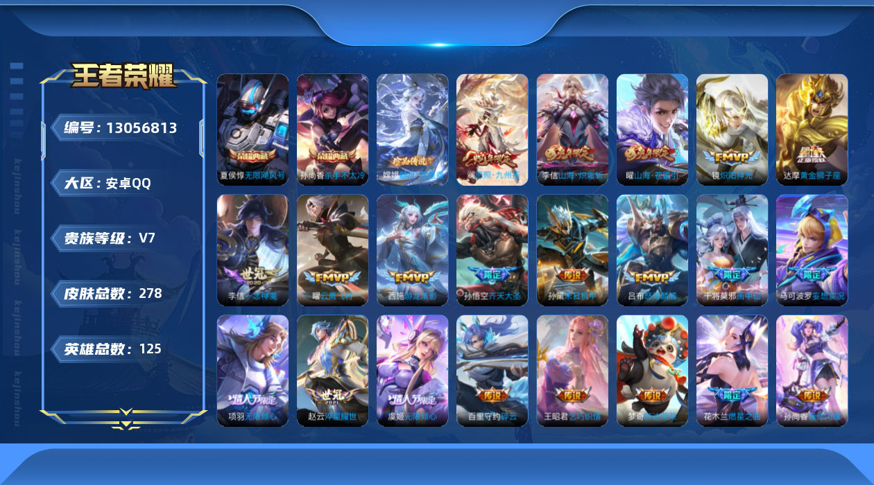 [13056813]安卓Q-V7-永恒钻石I段位-125英雄-278皮肤-2典藏-0珍品无双-0无双-1珍品传说-24传说-73史诗