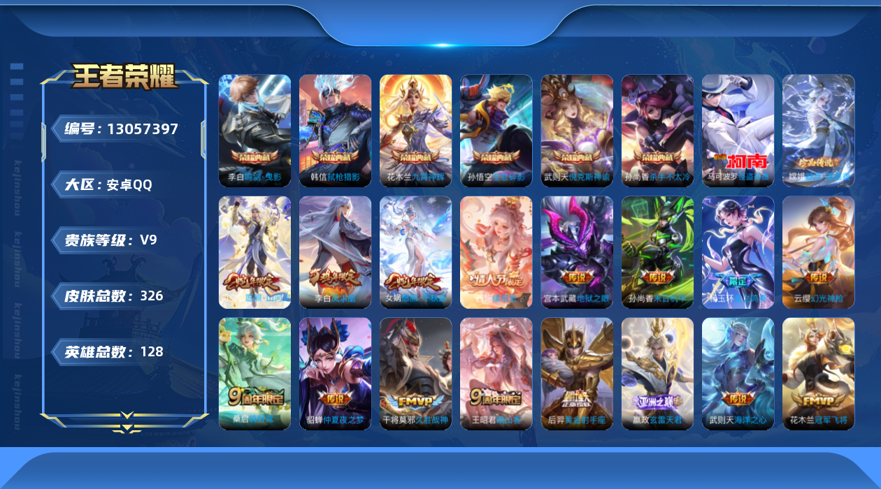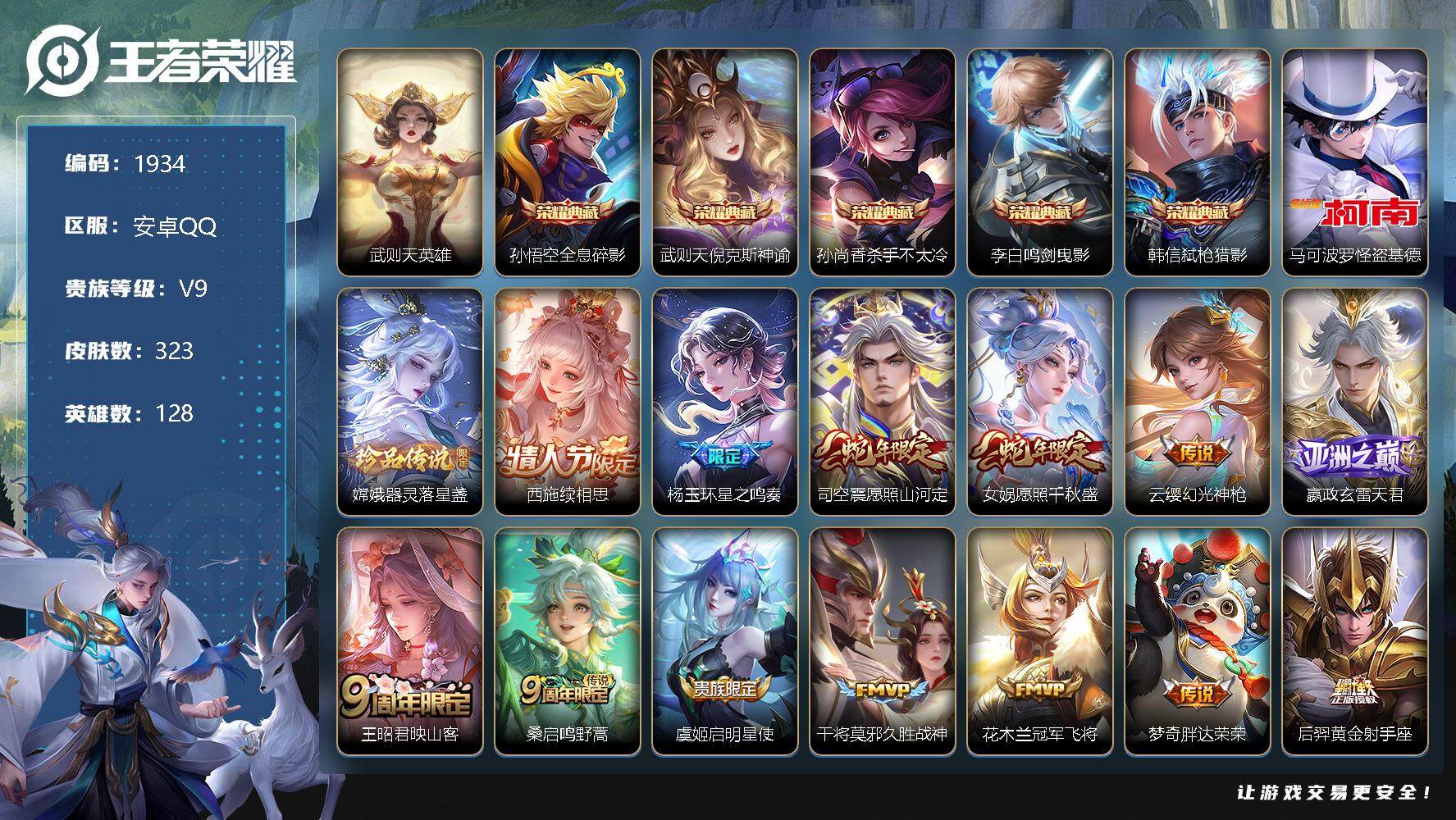 [13057397]安卓Q-V9-永恒钻石I段位-128英雄-323皮肤-5典藏-0珍品无双-0无双-2珍品传说-18传说-81史诗