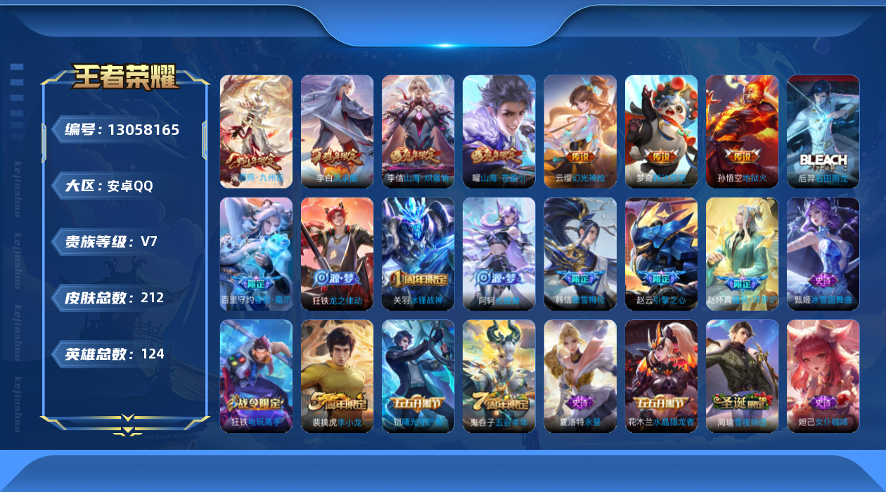 [13058165]安卓Q-V3-荣耀黄金I段位-124英雄-212皮肤-0典藏-0珍品无双-0无双-0珍品传说-7传说-57史诗