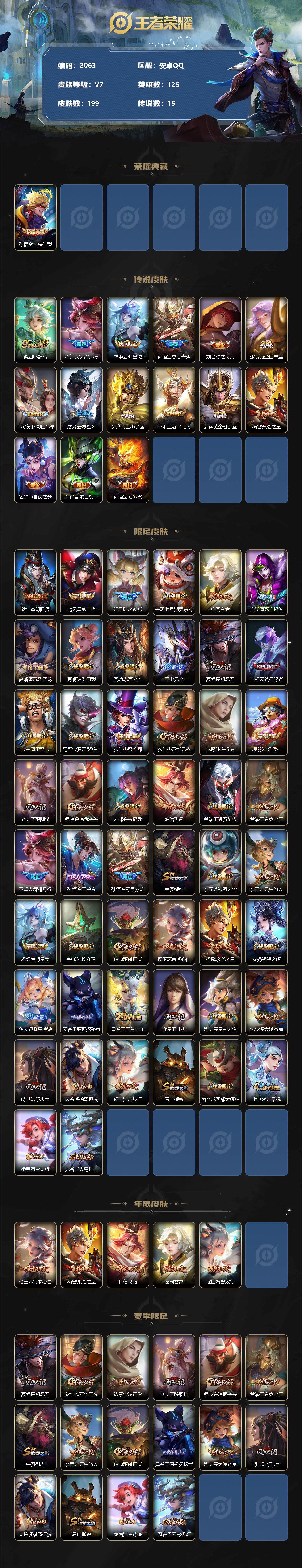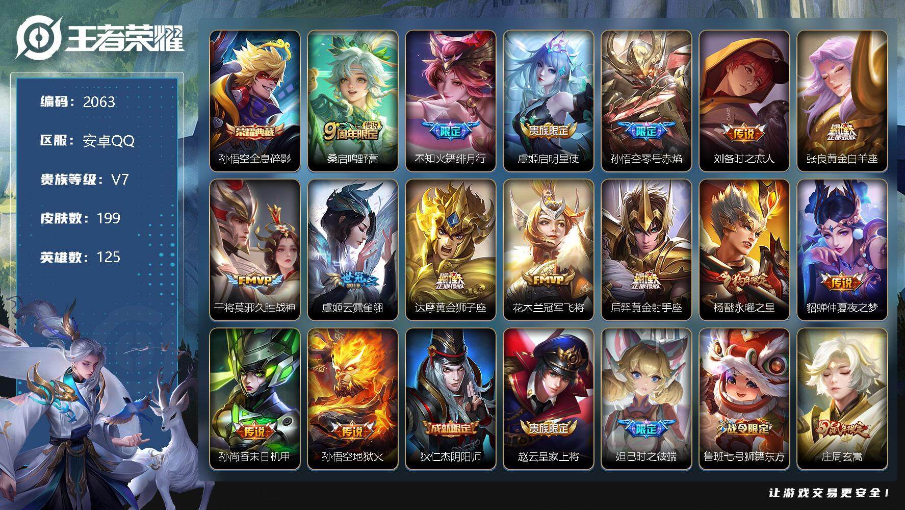 [13065174]安卓Q-V6-尊贵铂金IV段位-125英雄-199皮肤-1典藏-0珍品无双-0无双-0珍品传说-15传说-45史诗 【英雄全皮】:空空儿全皮 【荣耀典藏】:孙悟空全息碎影 【传说皮肤】:桑启鸣野蒿,不知火舞绯月行,虞姬启明星使,孙悟空零号赤焰,刘备时之恋人,张良黄金白羊座,干将莫邪久胜战神,虞姬云霓雀翎,达摩黄金狮子座,花木兰冠军飞将,后羿黄金射手座,杨戬永曜之星,貂蝉仲夏夜之梦,孙尚香末日机甲,孙悟空地狱火 【限定皮肤】:狄仁杰阴阳师,赵云皇家上将,妲己时之彼端,鲁班七号狮舞东方,庄周玄嵩,高渐离死亡摇滚,高渐离玩趣恶龙,阿轲迷踪丽影,周瑜赤莲之焰,元歌无心,夏侯惇朔风刀,曹操天狼征服者,典韦蓝屏警告,马可波罗暗影游猎,狄仁杰魔术师,狄仁杰万华元夜,达摩沙漠行僧,项羽海滩派对,老夫子醍醐杖,程咬金演武夺筹,刘邦夺宝奇兵,韩信飞衡,兰陵王驯魔猎人,兰陵王金庭之子,不知火舞绯月行,孙悟空至尊宝,孙悟空零号赤焰,牛魔御旌,李元芳银河之约,李元芳云中旅人,虞姬启明星使,钟馗神迹守卫,钟馗驱傩正仪,杨玉环寅虎心曲,杨戬永曜之星,女娲朔望之晖,蔡文姬繁星吟游,鬼谷子原初探秘者,鬼谷子五谷丰年,弈星混沌棋,沈梦溪星空之诺,沈梦溪大漠名商,明世隐疑决卦,裴擒虎擒涛扼浪,瑶山海碧波行,盾山御銮,猪八戒西部大镖客,上官婉儿梁祝,桑启海盐诗旅,鬼谷子天穹祈灯 【年限皮肤】:杨玉环寅虎心曲,杨戬永曜之星,韩信飞衡,庄周玄嵩,瑶山海碧波行 【赛季限定】:夏侯惇朔风刀,狄仁杰万华元夜,达摩沙漠行僧,老夫子醍醐杖,程咬金演武夺筹,兰陵王金庭之子,牛魔御旌,李元芳云中旅人,钟馗驱傩正仪,鬼谷子原初探秘者,弈星混沌棋,沈梦溪大漠名商,明世隐疑决卦,裴擒虎擒涛扼浪,盾山御銮,桑启海盐诗旅,鬼谷子天穹祈灯 【战令限定】:鲁班七号狮舞东方,阿轲迷踪丽影,周瑜赤莲之焰,典韦蓝屏警告,马可波罗暗影游猎,刘邦夺宝奇兵,兰陵王驯魔猎人,李元芳银河之约,钟馗神迹守卫,女娲朔望之晖,沈梦溪星空之诺,猪八戒西部大镖客 【史诗皮肤】:鲁班七号电玩小子,露娜紫霞仙子,赵云皇家上将,赵云未来纪元,王昭君偶像歌手,狄仁杰魔术师,宫本武藏鬼剑武藏,孙尚香水果甜心,妲己魅力维加斯,妲己女仆咖啡,吕布圣诞狂欢,李白千年之狐,孙悟空至尊宝,夏侯惇乘风破浪,小乔缤纷独角兽,兰陵王暗隐猎兽者,诸葛亮黄金分割率,安琪拉心灵骇客,百里守约