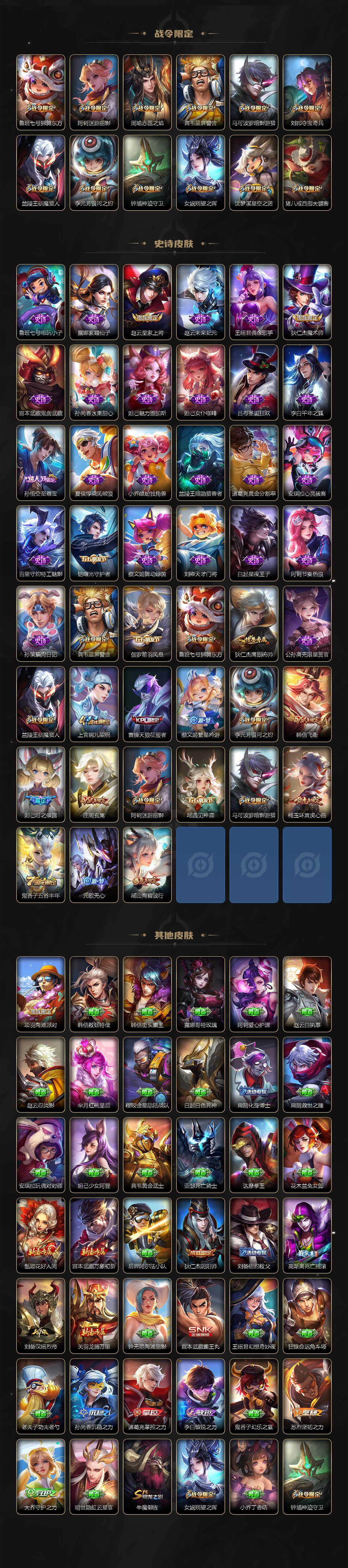 - [12047921]V8 2典藏 3珍品传说 11传说 126英雄 211皮肤 典藏英雄武则天 可修改实名 优质装备:全息碎影(猴子典藏),最初的交响(伽罗典藏),器灵·落星盏,黄金射手座,绛天战甲(鸡嘴战神),乞巧织情,末日机甲-孙策,浮生妄,千劫归真,涂山容容 珍品传说:时之奇旅-孙策,兔狲·蓬尾 传说皮:典韦战鼓燎原 限定皮:愿照·岁时盈(虞姬年限),愿照·众生和(妲己年限),愿照·千秋盛(女娲年限),逐梦之音,辉光之辰,如梦令-后羿,孙行者,引擎之心 史诗皮:鸭鸭历险记-刘禅,苍鳞隐世,器灵·浮梦炉,狼魂孤将,化蝶舞,龙之律动,藏狐·褐绒,百相守梦-周瑜,茶境仙,怒海争锋,芈月浮光幕影,蔬乡物语(鲁班七号),曹操夜都魔契,织梦人,紫霞仙子,苍穹之光,电玩小子(小书包),魅语,偶像歌手,白蛇,暗夜猫娘,龙骑士(小龙虾),末日机甲-吕布,乱世虎臣,节奏热浪,女仆咖啡,摇滚巨星,水果甜心,星夜王子,心灵骇客,功夫厨神,暗隐猎兽者,鬼剑武藏,心灵战警,乐园奇幻夜,舞动绿茵,诗语江南,纤云弄巧,乘风破浪,圣诞狂欢,圣诞恋歌,鹰眼统帅,魅力维加斯,未来纪元-赵云
