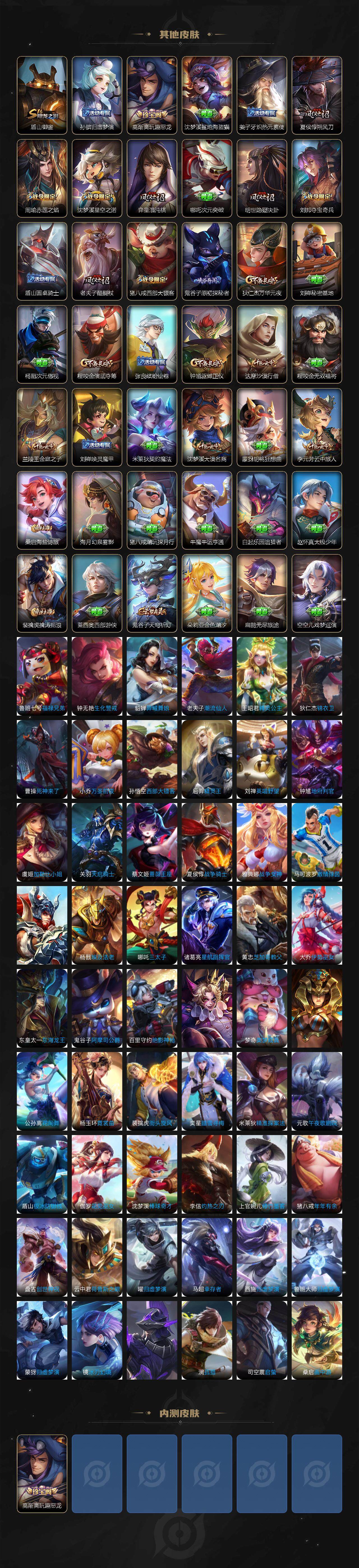 【限定皮肤】:狄仁杰阴阳师,赵云皇家上将,妲己时之彼端,鲁班七号狮舞东方,庄周玄嵩,高渐离死亡摇滚,高渐离玩趣恶龙,阿轲迷踪丽影,周瑜赤莲之焰,元歌无心,夏侯惇朔风刀,曹操天狼征服者,典韦蓝屏警告,马可波罗暗影游猎,狄仁杰魔术师,狄仁杰万华元夜,达摩沙漠行僧,项羽海滩派对,老夫子醍醐杖,程咬金演武夺筹,刘邦夺宝奇兵,韩信飞衡,兰陵王驯魔猎人,兰陵王金庭之子,不知火舞绯月行,孙悟空至尊宝,孙悟空零号赤焰,牛魔御旌,李元芳银河之约,李元芳云中旅人,虞姬启明星使,钟馗神迹守卫,钟馗驱傩正仪,杨玉环寅虎心曲,杨戬永曜之星,女娲朔望之晖,蔡文姬繁星吟游,鬼谷子原初探秘者,鬼谷子五谷丰年,弈星混沌棋,沈梦溪星空之诺,沈梦溪大漠名商,明世隐疑决卦,裴擒虎擒涛扼浪,瑶山海碧波行,盾山御銮,猪八戒西部大镖客,上官婉儿梁祝,桑启海盐诗旅,鬼谷子天穹祈灯