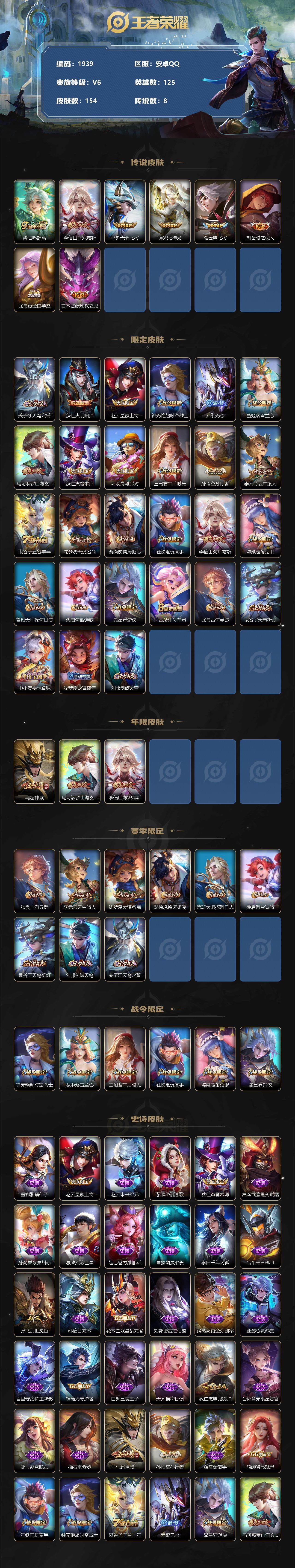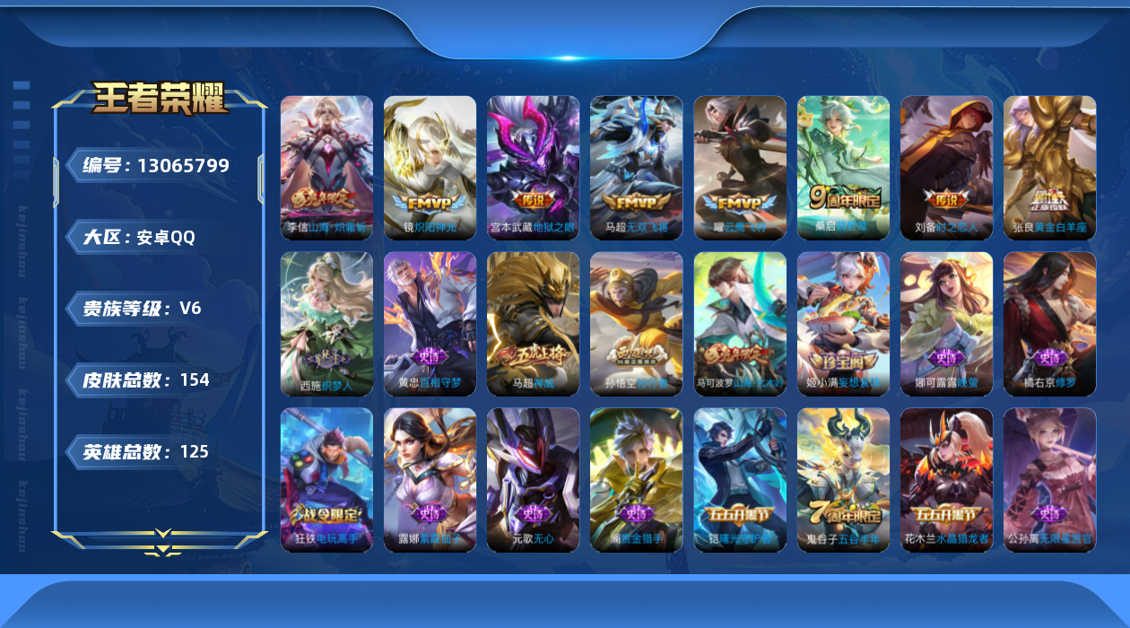 [13065799]安卓Q-V0-至尊星耀IV段位-125英雄-154皮肤-0典藏-0珍品无双-0无双-0珍品传说-8传说-40史诗