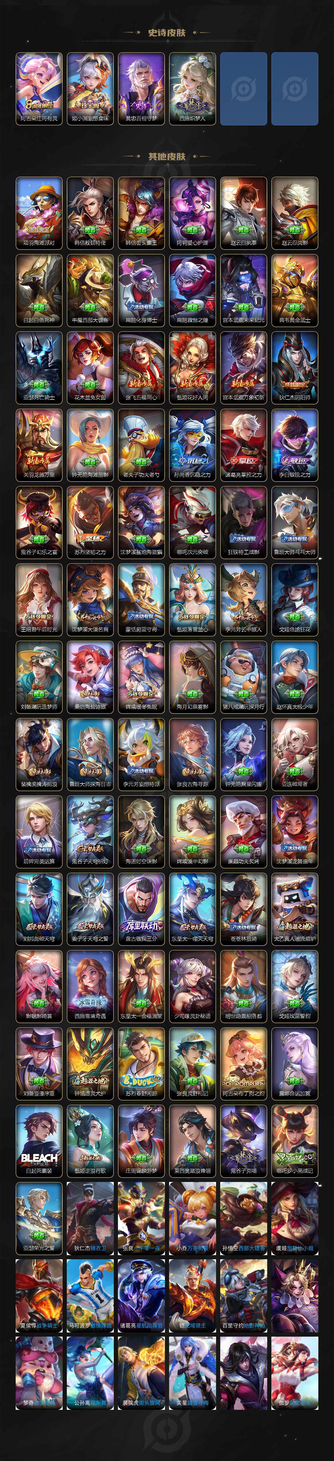 【史诗皮肤】:露娜紫霞仙子,赵云皇家上将,赵云未来纪元,貂蝉圣诞恋歌,狄仁杰魔术师,宫本武藏鬼剑武藏,孙尚香水果甜心,嬴政摇滚巨星,妲己魅力维加斯,曹操幽灵船长,李白千年之狐,吕布末日机甲,张飞乱世虎臣,韩信白龙吟,花木兰水晶猎龙者,刘邦德古拉伯爵,诸葛亮黄金分割率,亚瑟心灵战警,百里守约特工魅影,铠曙光守护者,白起星夜王子,大乔猫狗日记,狄仁杰鹰眼统帅,公孙离无限星赏官,娜可露露晚萤,橘右京修罗,马超神威,孙悟空孙行者,澜赏金猎手,貂蝉唤灵魅影,狂铁电玩高手,钟无艳超时空战士,鬼谷子五谷丰年,元歌无心,暃星界游侠,马可波罗山海玄木吟,阿古朵江河有灵,姬小满妄想食味,黄忠百相守梦,西施织梦人