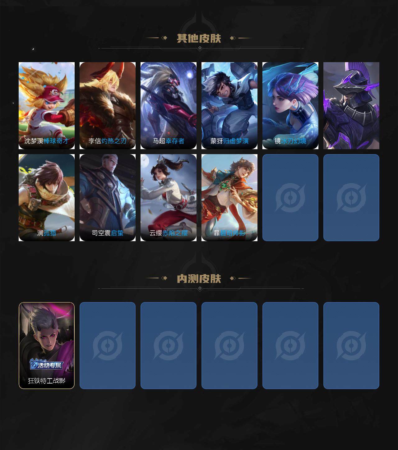 【其他皮肤】:项羽海滩派对,韩信教廷特使,韩信街头霸王,阿轲爱心护理,赵云白执事,赵云忍炎影,白起白色死神,牛魔西部大镖客,扁鹊化身博士,扁鹊救世之瞳,宫本武藏未来纪元,典韦黄金武士,亚瑟死亡骑士,花木兰兔女郎,张飞五福同心,甄姬花好人间,宫本武藏万象初新,狄仁杰阴阳师,关羽龙腾万里,钟无艳海滩丽影,老夫子功夫老勺,孙尚香沉稳之力,诸葛亮掌控之力,李白敏锐之力,鬼谷子幻乐之宴,苏烈坚韧之力,沈
