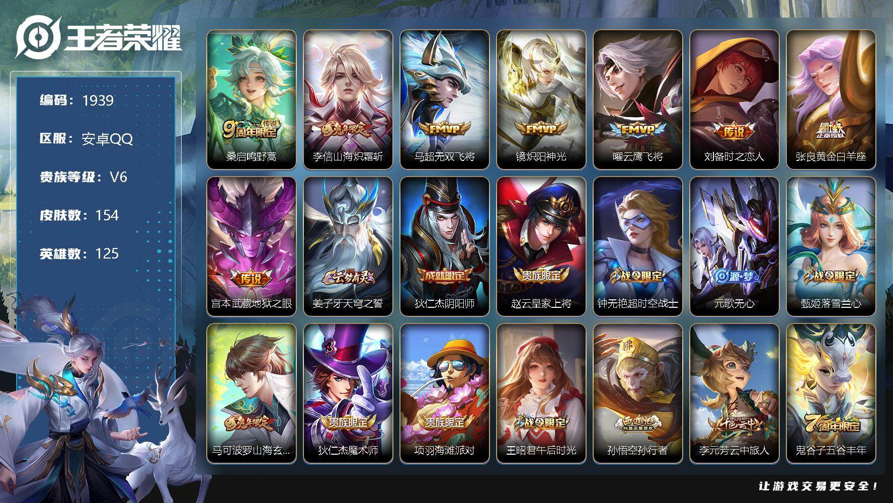 [13065799]安卓Q-V0-至尊星耀IV段位-125英雄-154皮肤-0典藏-0珍品无双-0无双-0珍品传说-8传说-40史诗 【英雄全皮】:影全皮 【传说皮肤】:桑启鸣野蒿,李信山海炽霜斩,马超无双飞将,镜炽阳神光,曜云鹰飞将,刘备时之恋人,张良黄金白羊座,宫本武藏地狱之眼 【限定皮肤】:姜子牙天穹之誓,狄仁杰阴阳师,赵云皇家上将,钟无艳超时空战士,元歌无心,甄姬落雪兰心,马可波罗山海玄木吟,狄仁杰魔术师,项羽海滩派对,王昭君午后时光,孙悟空孙行者,李元芳云中旅人,鬼谷子五谷丰年,沈梦溪大漠名商,裴擒虎擒涛扼浪,狂铁电玩高手,李信山海炽霜斩,嫦娥暖冬兔眠,鲁班大师探海日志,桑启海盐诗旅,暃星界游侠,阿古朵江河有灵,张良古海寻踪,鬼谷子天穹祈灯,姬小满妄想食味,沈梦溪龙舞盛年,刘邦剑破天穹 【年限皮肤】:马超神威,马可波罗山海玄木吟,李信山海炽霜斩 【赛季限定】:张良古海寻踪,李元芳云中旅人,沈梦溪大漠名商,裴擒虎擒涛扼浪,鲁班大师探海日志,桑启海盐诗旅,鬼谷子天穹祈灯,刘邦剑破天穹,姜子牙天穹之誓 【战令限定】:钟无艳超时空战士,甄姬落雪兰心,王昭君午后时光,狂铁电玩高手,嫦娥暖冬兔眠,暃星界游侠 【史诗皮肤】:露娜紫霞仙子,赵云皇家上将,赵云未来纪元,貂蝉圣诞恋歌,狄仁杰魔术师,宫本武藏鬼剑武藏,孙尚香水果甜心,嬴政摇滚巨星,妲己魅力维加斯,曹操幽灵船长,李白千年之狐,吕布末日机甲,张飞乱世虎臣,韩信白龙吟,花木兰水晶猎龙者,刘邦德古拉伯爵,诸葛亮黄金分割率,亚瑟心灵战警,百里守约特工魅影,铠曙光守护者,白起星夜王子,大乔猫狗日记,狄仁杰鹰眼统帅,公孙离无限星赏官,娜可露露晚萤,橘右京修罗,马超神威,孙悟空孙行者,澜赏金猎手,貂蝉唤灵魅影,狂铁电玩高手,钟无艳超时空战士,鬼谷子五谷丰年,元歌无心,暃星界游侠,马可波罗山海玄木吟,阿古朵江河有灵,姬小满妄想食味,黄忠百相守梦,西施织梦人 【其他皮肤】:项羽海滩派对,韩信教廷特使,韩信街头霸王,阿轲爱心护理,赵云白执事,赵云忍炎影,白起白色死神,牛魔西部大镖客,扁鹊化身博士,扁鹊救世之瞳,宫本武藏未来纪元,典韦黄金武士,亚瑟死亡骑士,花木兰兔女郎,张飞五福同心,甄姬花好人间,宫本武藏万象初新,狄仁杰阴阳师,关羽龙腾万里,钟无艳海滩丽影,老夫子功夫老勺,孙尚香沉稳之力,诸葛亮掌控之力,李白敏锐之力,鬼谷子幻乐之宴,苏烈坚韧之力,沈