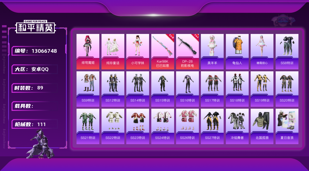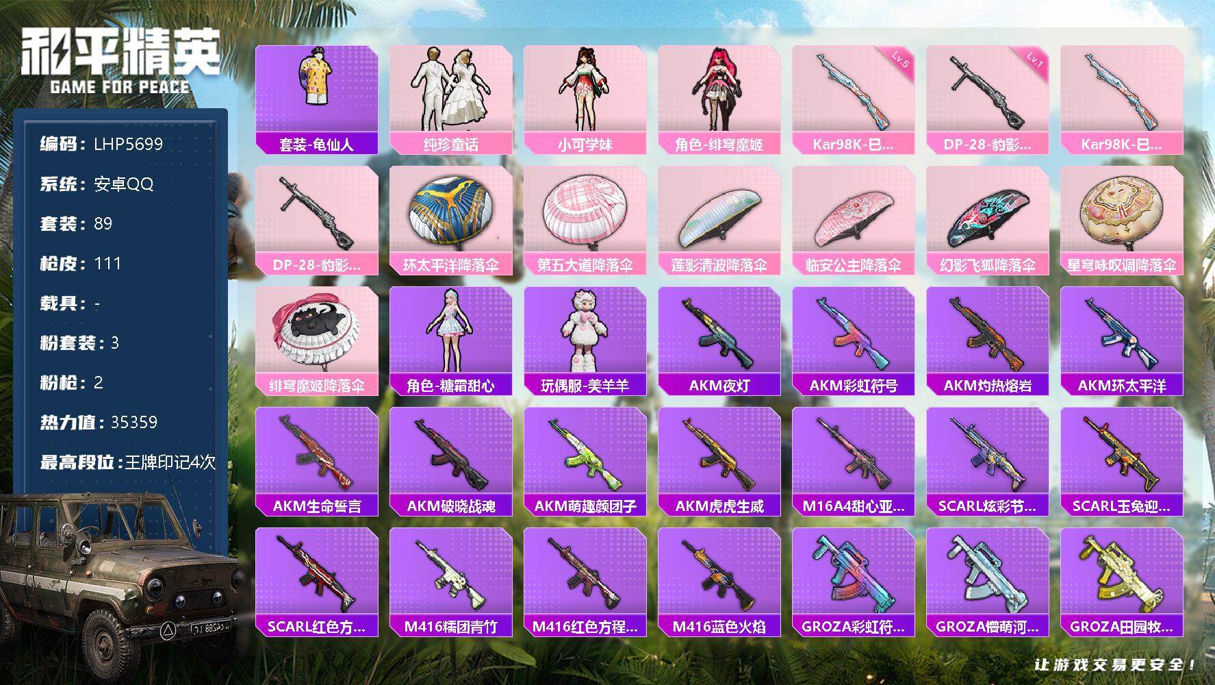 [13066748]安卓 手Q-3粉装-2特效枪-3.5w热力值-4王牌印记-89套装-111枪皮【热门品类】:套装-龟仙人【粉色套装】:粉装-纯珍童话,角色-小可学妹,角色-绯穹魔姬【粉色枪皮等级】:Kar98K-巳巳如意(五级),DP-28-豹影疾电(一级)