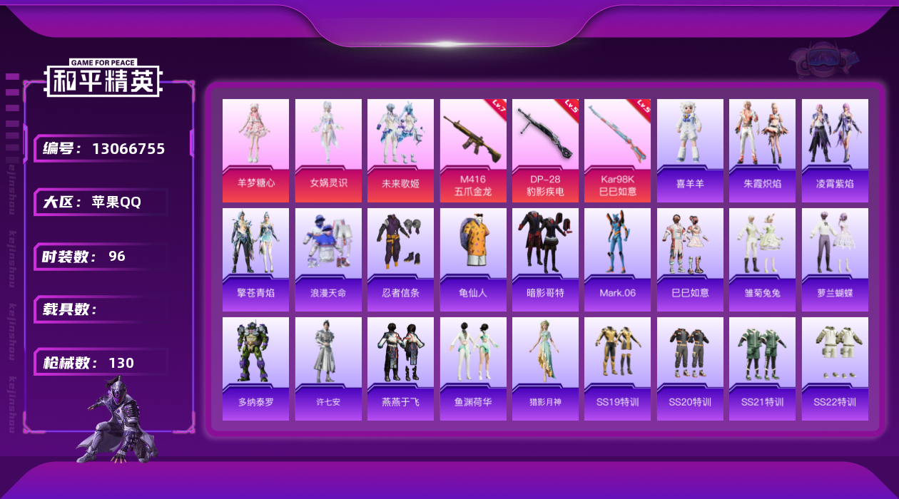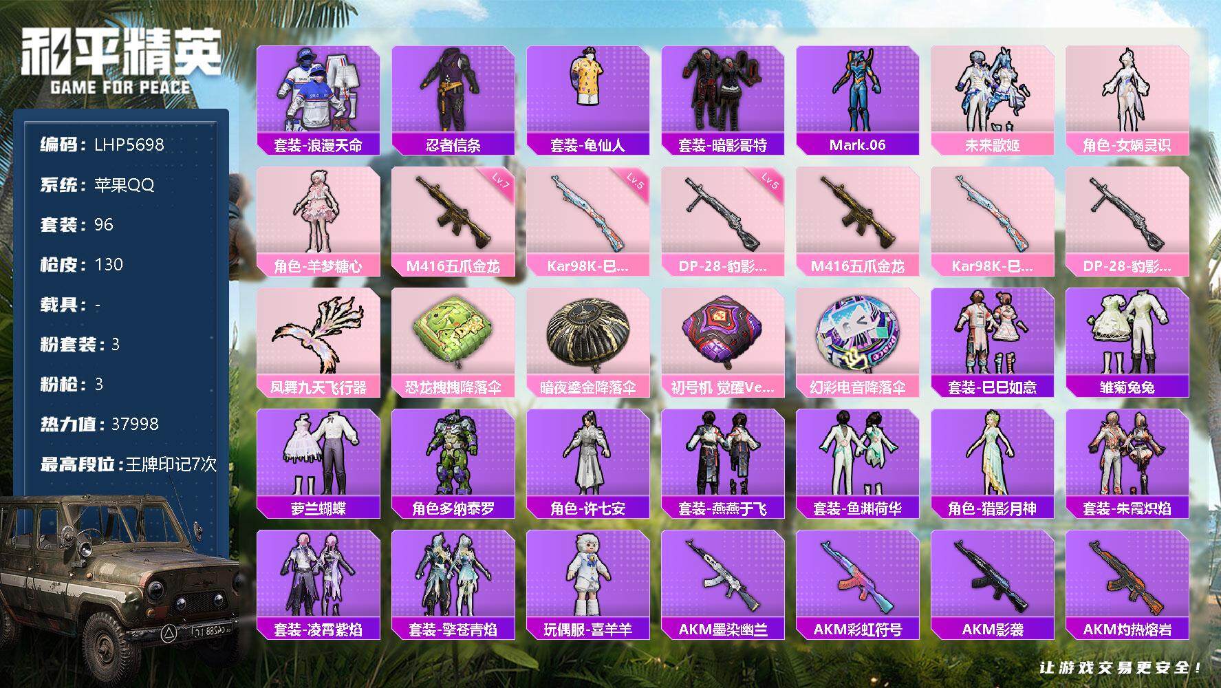 [13066755]地铁满天赋 苹果 手Q-3粉装-3特效枪-1粉色飞行器-3.7w热力值-7王牌印记-96套装-130枪皮【热门品类】:套装-浪漫天命,套装-忍者信条,套装-龟仙人,套装-暗影哥特,角色-Mark.06【粉色套装】:粉装-未来歌姬,角色-女娲灵识,角色-羊梦糖心【粉色枪皮等级】:M416-五爪金龙(七级),Kar98K-巳巳如意(五级),DP-28-豹影疾电(五级)【粉色飞行器】:凤舞九天飞行器