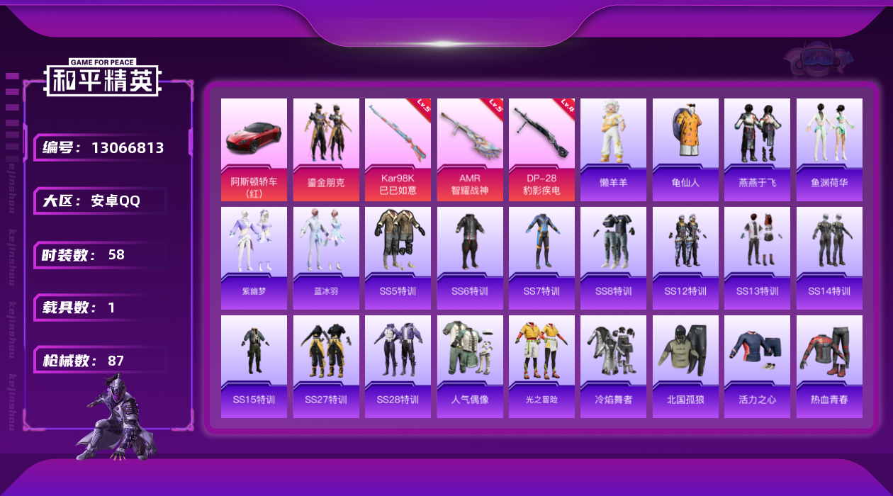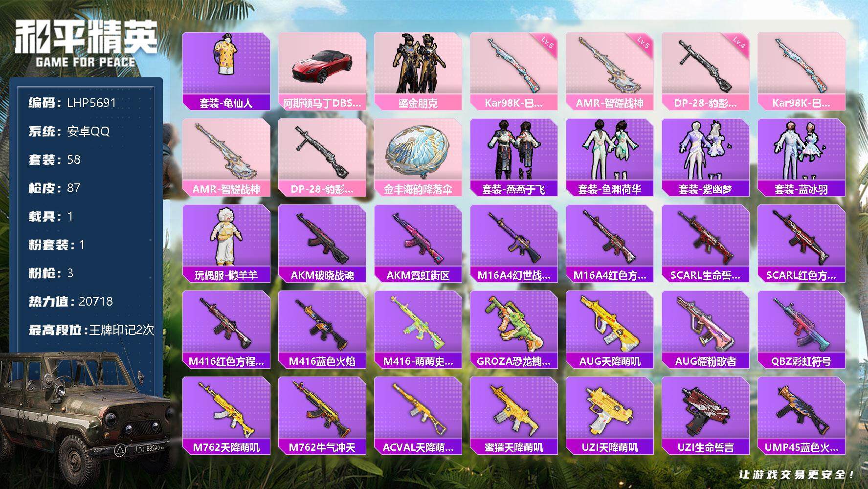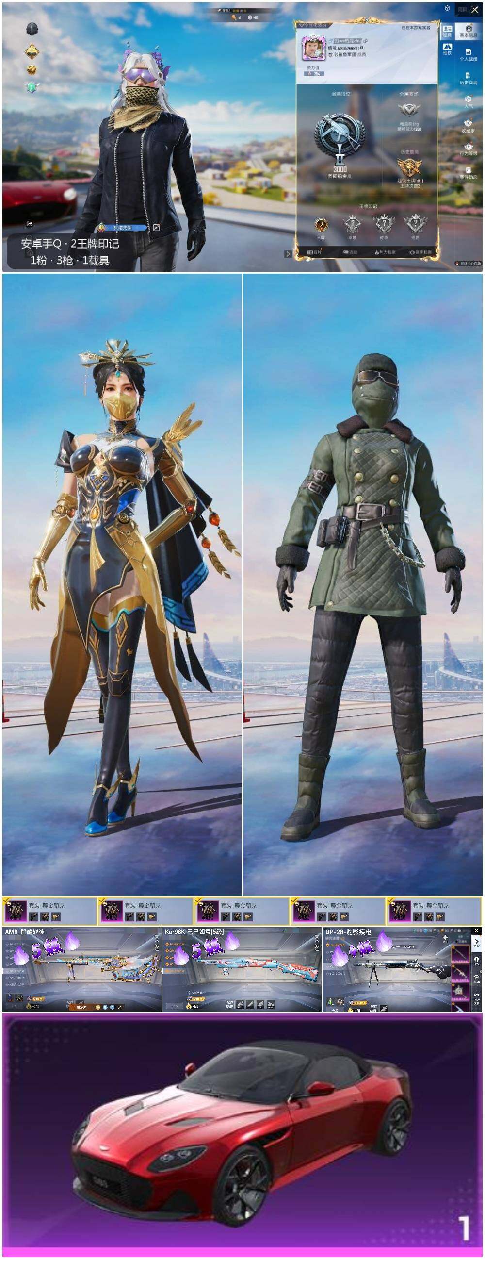 [13066813]安卓 手Q-1粉装-3特效枪-1载具-2w热力值-2王牌印记-58套装-87枪皮【热门品类】:套装-龟仙人【粉色载具】:阿斯顿马丁DBS(红)【粉色套装】:粉装-鎏金朋克【粉色枪皮等级】:Kar98K-巳巳如意(五级),AMR-智耀战神(五级),DP-28-豹影疾电(四级)
