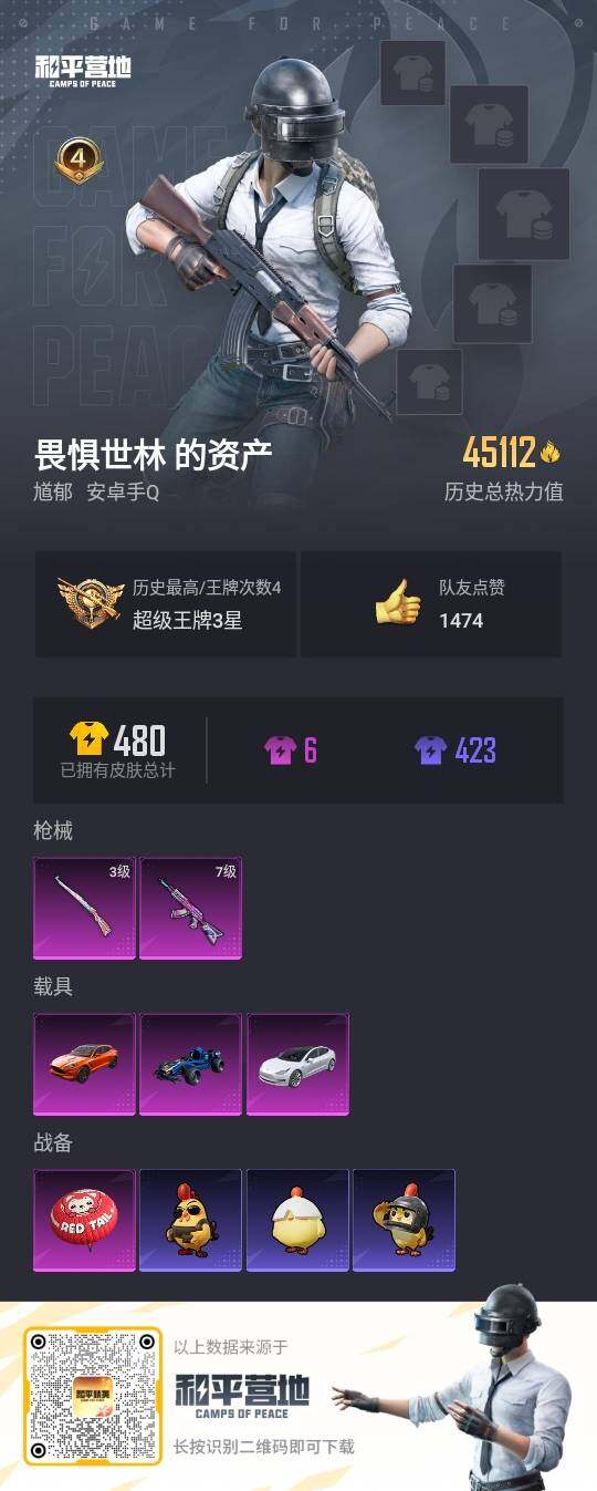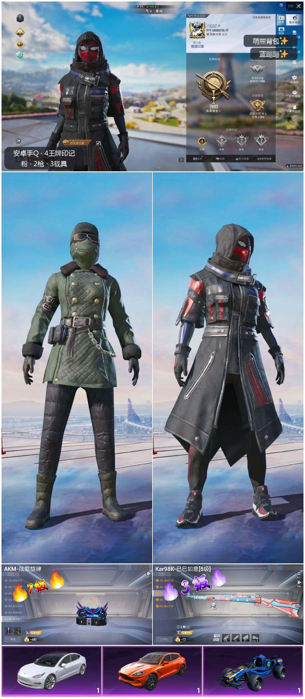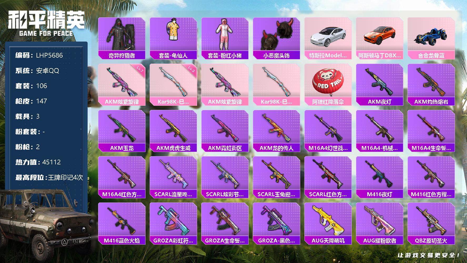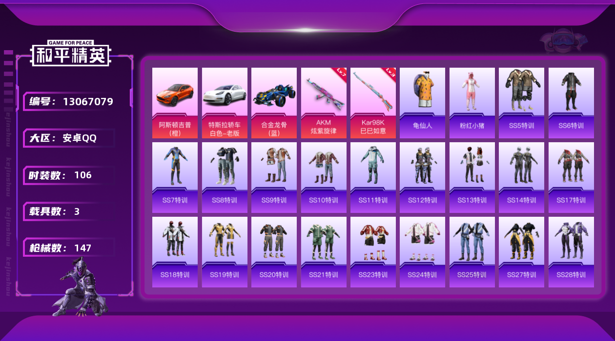 [13067079]地铁满天赋 安卓 手Q-2特效枪-3载具-4.5w热力值-4王牌印记-106套装-147枪皮【热门品类】:套装-奇异狩猎者,套装-龟仙人,套装-粉红小猪,小恶魔头饰【粉色载具】:特斯拉Model 3(珍珠白),阿斯顿马丁DBX(橙),合金龙骨(蓝)【粉色枪皮等级】:AKM-炫紫旋律(七级),Kar98K-巳巳如意(三级)