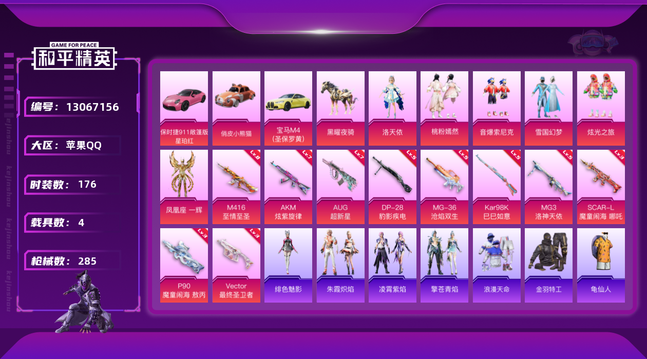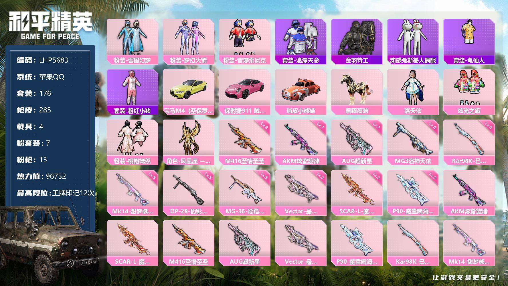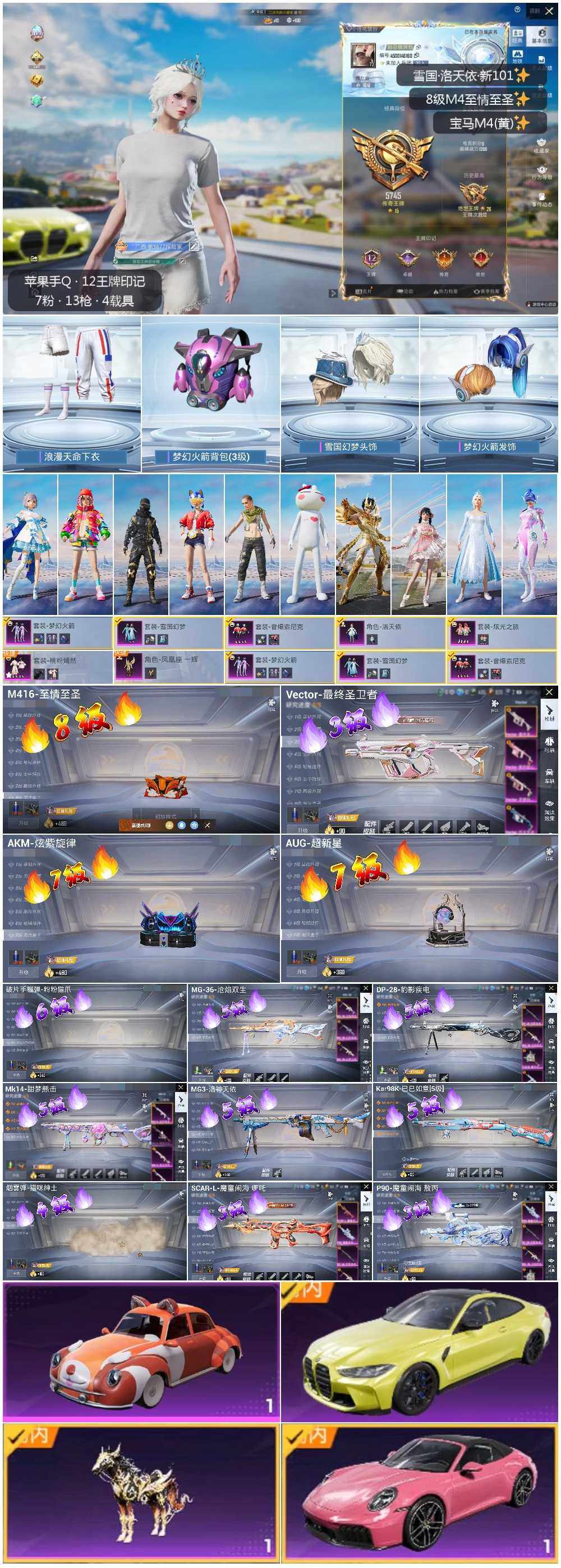[13067156]素材身法号/绝世印记1/地铁满天赋 苹果 手Q-7粉装-13特效枪-4载具-6粉色飞行器-9.6w热力值-12王牌印记-176套装-285枪皮【热门品类】:粉装-雪国幻梦,粉装-梦幻火箭,粉装-音爆索尼克,套装-浪漫天命,套装-金羽特工,套装-动感兔斯基人偶服,套装-龟仙人,套装-粉红小猪【粉色载具】:宝马M4(圣保罗黄),保时捷911 敞篷版(星珀红),俏皮小熊猫,黑曜夜骑【粉色套装】:粉装-雪国幻梦,粉装-梦幻火箭,角色-洛天依,粉装-音爆索尼克,粉装-炫光之旅,粉装-桃粉嫣然,角色-凤凰座 一辉【粉色枪皮等级】:AKM-炫紫旋律(七级),SCAR-L-魔童闹海 哪吒(三级),M416-至情至圣(八级),AUG-超新星(七级),Vector-最终圣卫者(三级),P90-魔童闹海 敖丙(三级),Kar98K-巳巳如意(五级),Mk14-甜梦熊击(五级),DP-28-豹影疾电(五级),MG3-洛神天依(五级),MG-36-沧焰双生(五级)【粉色飞行器】:梦幻火箭飞行器,拂晓神骑飞行器,终晖之翼飞行器,灵猫魔法师飞行器,灵珠游龙飞行器