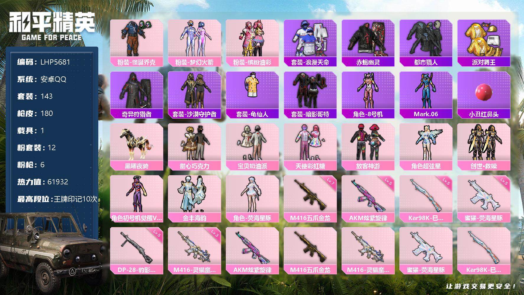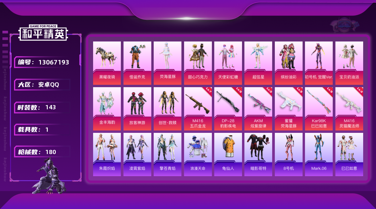 [13067193]素材身法号 安卓 手Q-12粉装-6特效枪-1载具-1粉色飞行器-6.1w热力值-10王牌印记-143套装-180枪皮【热门品类】:粉装-怪诞乔克,粉装-梦幻火箭,粉装-缤纷油彩,套装-浪漫天命,套装-赤蝎幽灵,套装-都市猎人,套装-派对舞王,套装-奇异狩猎者,套装-沙漠守护者,套装-龟仙人,套装-暗影哥特,角色-8号机,角色-Mark.06,小丑红鼻头【粉色载具】:黑曜夜骑【粉色套装】:粉装-怪诞乔克,粉装-甜心巧克力,粉装-宝贝奶油派,粉装-天使彩虹糖,粉装-梦幻火箭,粉装-缤纷油彩,粉装-放客神游,角色-超弦星,套装-创世·救赎,角色-初号机 觉醒Ver.,粉装-金丰海韵,角色-荧海星豚【粉色枪皮等级】:AKM-炫紫旋律(五级),M416-五爪金龙(七级),M416-灵猫魔法师(三级),蜜獾-荧海星豚(五级),Kar98K-巳巳如意(五级),DP-28-豹影疾电(五级)【粉色飞行器】:灵猫魔法师飞行器
