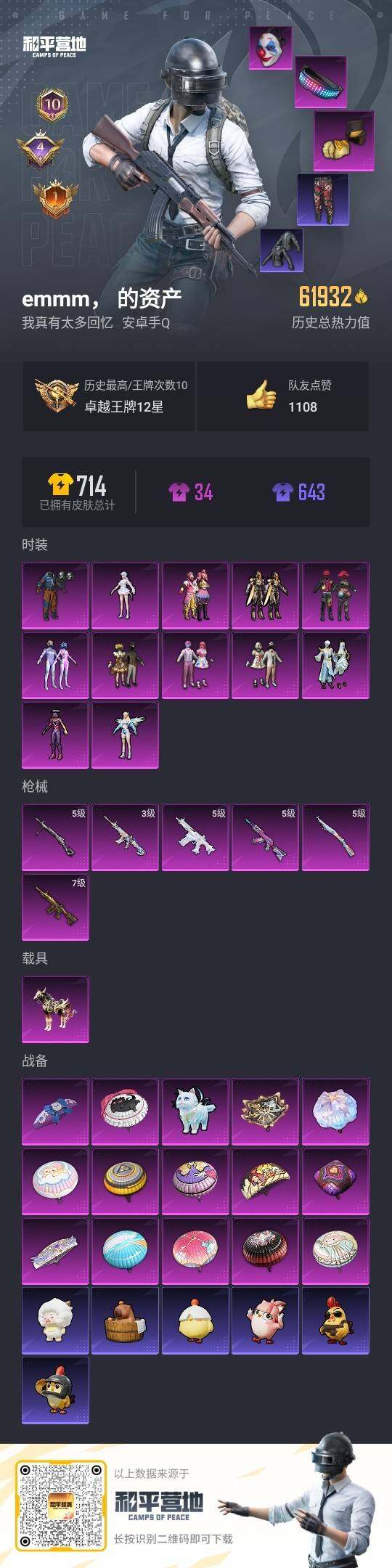 - PX_2069329- 包人脸 苹果手Q-3王牌印记-1粉装-4特效枪-0载具-20478热力值-51套装-70枪皮-1卓越印记-0传奇印记 【1粉装】,智耀战神 【4特效枪】,GROZA-镜光银凌-5级 AUG-暖羊咩咩-5级 Kar98K-巳巳如意-5级 AMR-智耀战神-4级 【3稀有紫装】,派对舞王,浪漫天命,龟仙人, 【51稀有时装】,蓝冰羽,恋语绒绒,紫幽梦,青瓷战姬,浪漫天命,龟仙