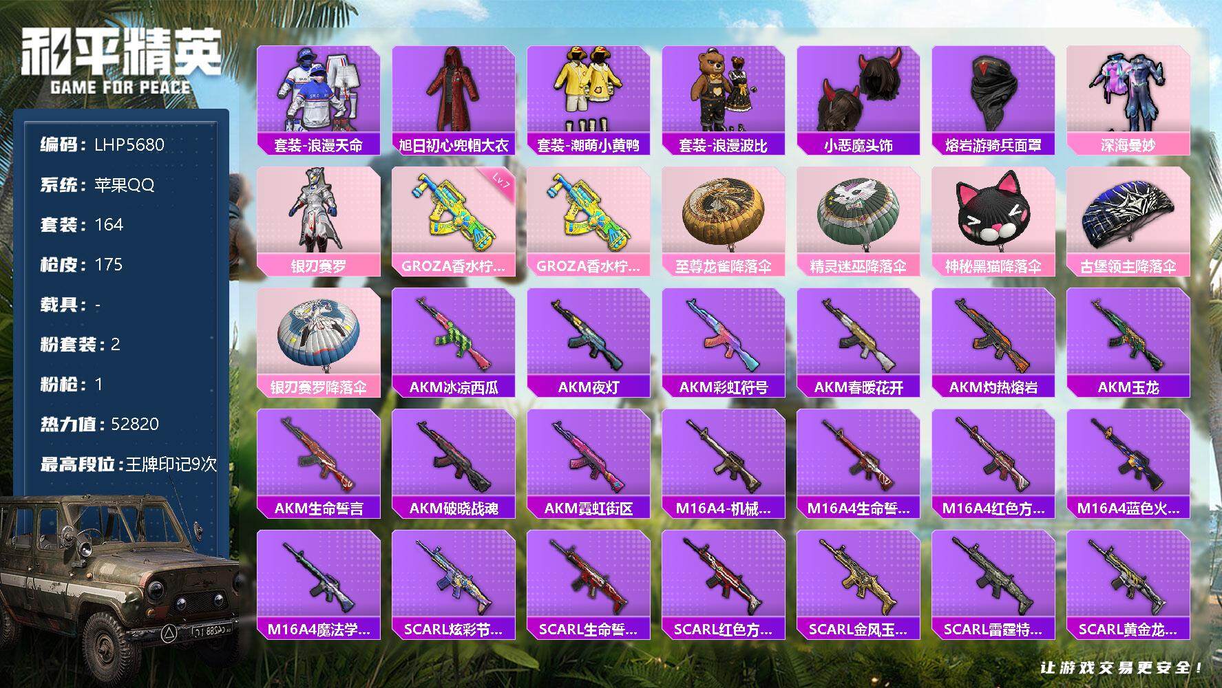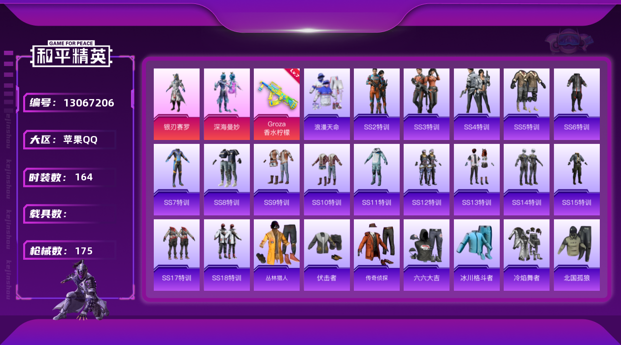 [13067206]苹果 手Q-2粉装-1特效枪-5.2w热力值-9王牌印记-164套装-175枪皮【热门品类】:套装-浪漫天命,旭日初心兜帽大衣,套装-潮萌小黄鸭,套装-浪漫波比,小恶魔头饰,熔岩游骑兵面罩【粉色套装】:粉装-深海曼妙,粉装-银刃赛罗【粉色枪皮等级】:GROZA-香水柠檬(七级)